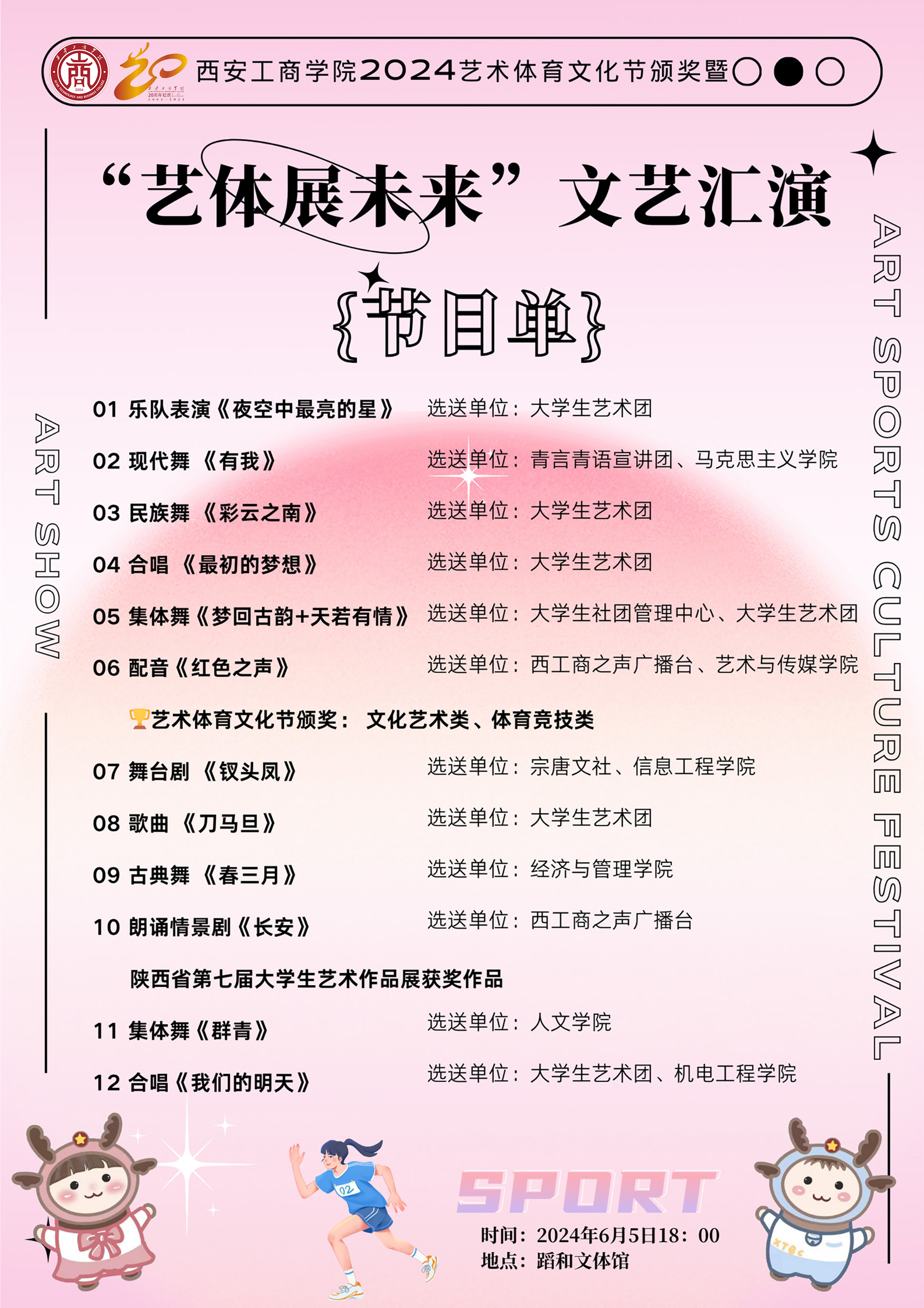 为营造蓬勃向上、开拓进取的校园文化氛围,增强师生凝聚力、向心力,展现新时代青年积极向上的健康风貌。经研究,决定举办“2024艺术体育文化节暨'艺体展未来”文艺汇演,现将有关事宜通知如下: