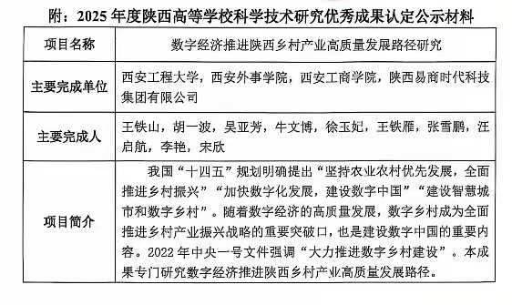 根据陕西省教育厅相关要求,现将我单位吴亚芳、张雪鹏参与完成的拟申报2025年度陕西高等学校科学技术研究优秀成果认定"数字经济推进陕西乡村产业高质量发展路径研究"的相关材料,按照相关要求于 2024 年12月9日至12月13日进行公示。公示的具体内容详见所附公示材料。