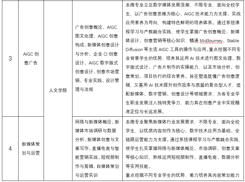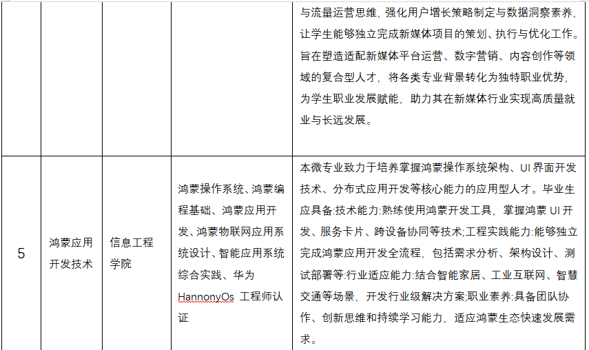 本次推出的5个微专业各具特色,精准对接行业前沿需求:经济与管理学院牵头的“碳中和经营管理”聚焦“双碳”战略,培养碳资产运营、绿色金融领域专业人才;“智信会计”融合区块链与数据分析技术,打造智能财务复合型人才;信息工程学院“鸿蒙应用开发”依托华为生态资源,主攻国产操作系统应用开发,填补信创产业人才缺口;人文学院“新媒体策划与运营”聚焦内容创作、流量运营与直播电商实战,适配数字媒体行业发展;“AIGC创意广告”则将人工智能技术与广告设计深度结合,培养新型创意设计人才。