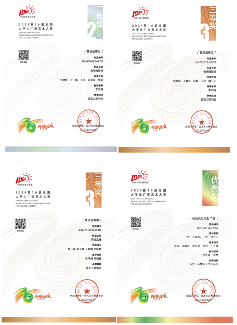 西安工商学院人文学院的七支团队在第16届全国大学生广告艺术大赛中表现优异,人文学院新闻传播系共获得7项奖项,人文学院新闻