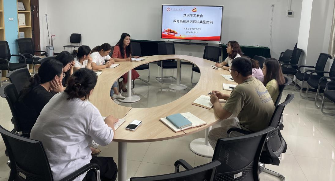 机电工程学院党总支在会议室组织全体教工党员开展了“党纪学习教育——教育系统违法典型案例”主题党日活动,旨在深入学习贯彻新