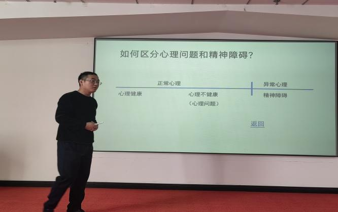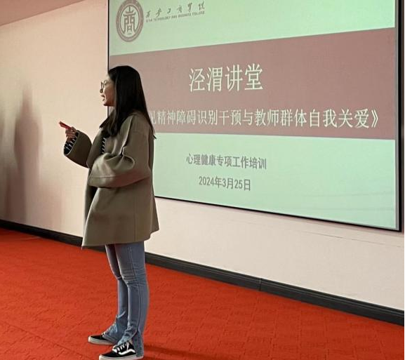 当前社会对心理健康与精神卫生的关注度不断提升。对于教师群体而言,由于其工作压力大、情绪波动复杂等特点,他们更容易面临心理健康问题。为提升我校教师心理健康水平,提高学工人员对常见精神障碍的认识和自我关爱能力,进而帮助他们更好地应对工作和生活中的挑战。3月25日下午,我校学生处大学生心理健康教育中心邀请高陵区精神卫生中心的心理治疗师曹立强,于众创空间路演大厅开展主题为《常见精神障碍识别与教师群体自我关爱》的心理健康专题培训讲座。
