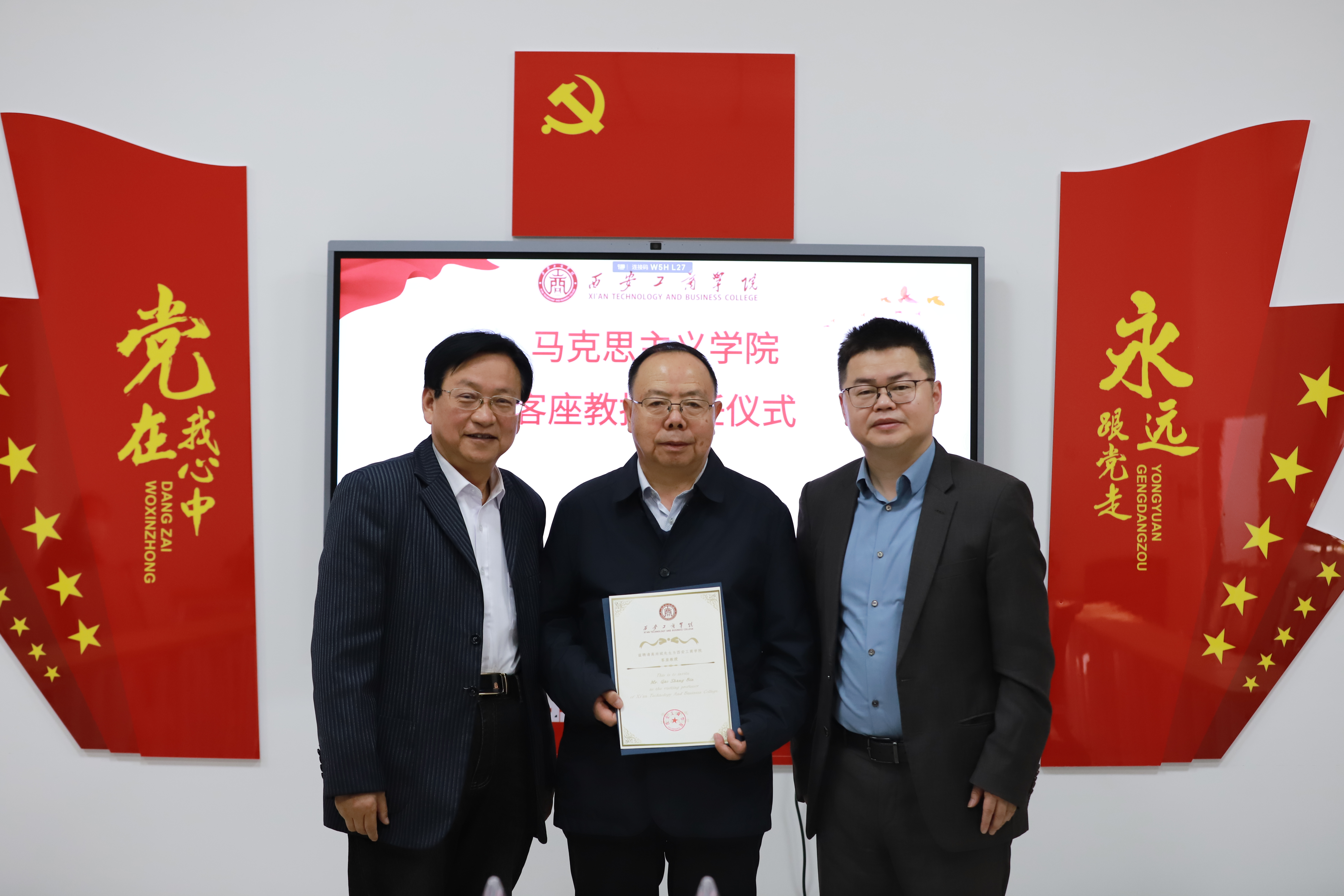 3月28日上午,西安工商学院马克思主义学院客座教授聘任仪式在学院会议室举行,聘任高尚斌教授为马克思主义学院客座教授,党委书记田伏虎,副董事长、常务副校长龙和平,党委副书记杨红雨,人事处处长闫海霞出席仪式,聘任仪式由人事处处长闫海霞主持,马克思主义学院院长严建会、副院长王珊珊及教师代表共同参加。