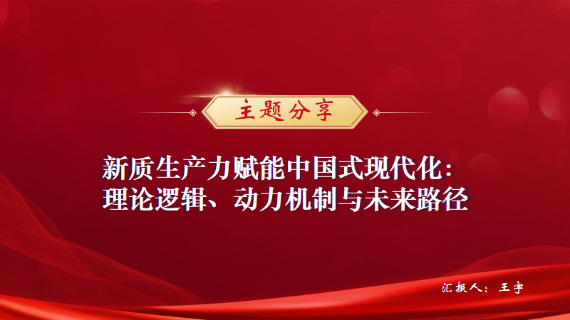 此次分享会由马克思主义学院三位专职教师带来理论分享,首先王宇老师带来以《新质生产力赋能中国式现代化:理论逻辑、动力机制与未来路径》为题的理论研学分享。王老师从理论逻辑、动力机制及其未来路径等方面深度解析了新质生产力赋能中国式现代化的经济、社会和环境三大价值维度。未来,需要构建双支柱举国体制促进技术创新,建立良好的创新环境和创新文化完善组织创新,构建长效的制度创新机制,更好地支持新质生产力的发展。