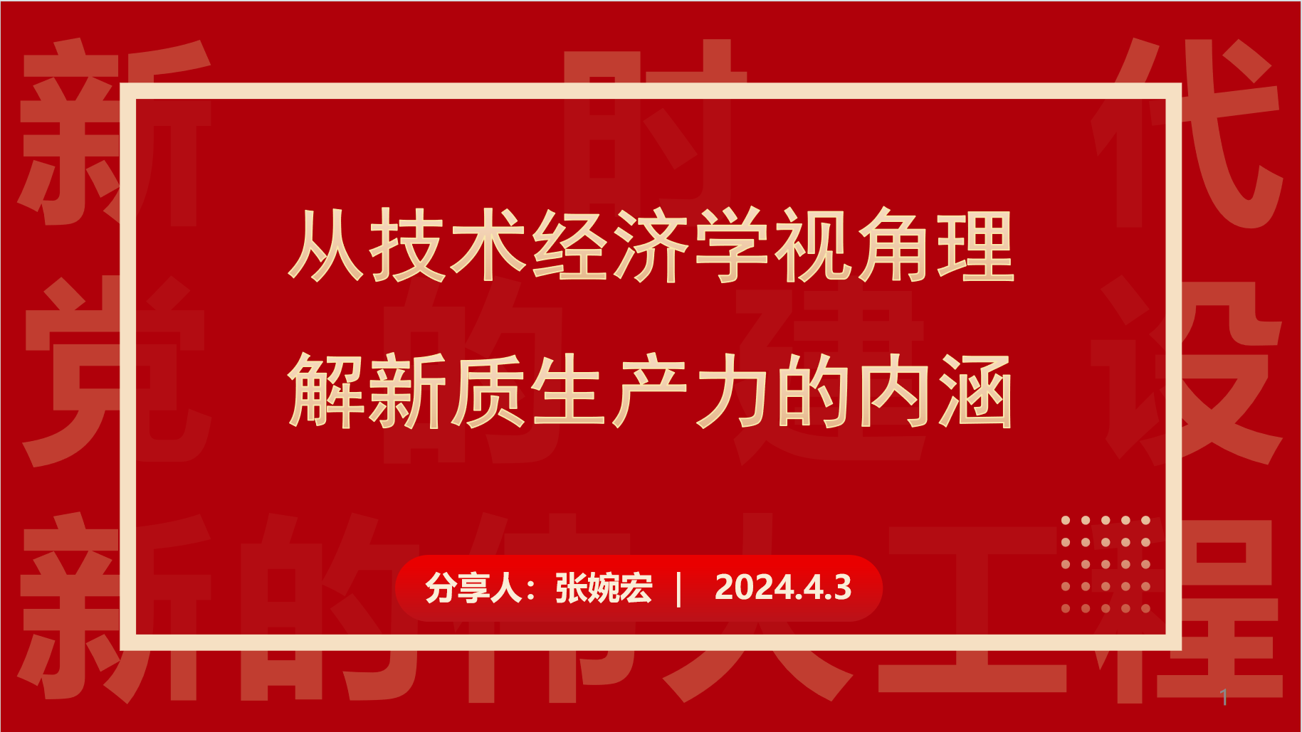其次,张婉宏老师为大家带来了以《从技术经济学视角理解新质生产力的内涵》为题的理论分享,张老师从立足技术经济学视角,从科学技术的生产力属性、变革属性、效率属性和价值属性,科学准确把握新质生产力,让我们对新一轮科技革命和产业变革与经济发展关系有了新认识,进一步深化了我们对马克思主义生产力发展规律的认识,也更深入理解了习近平经济思想。