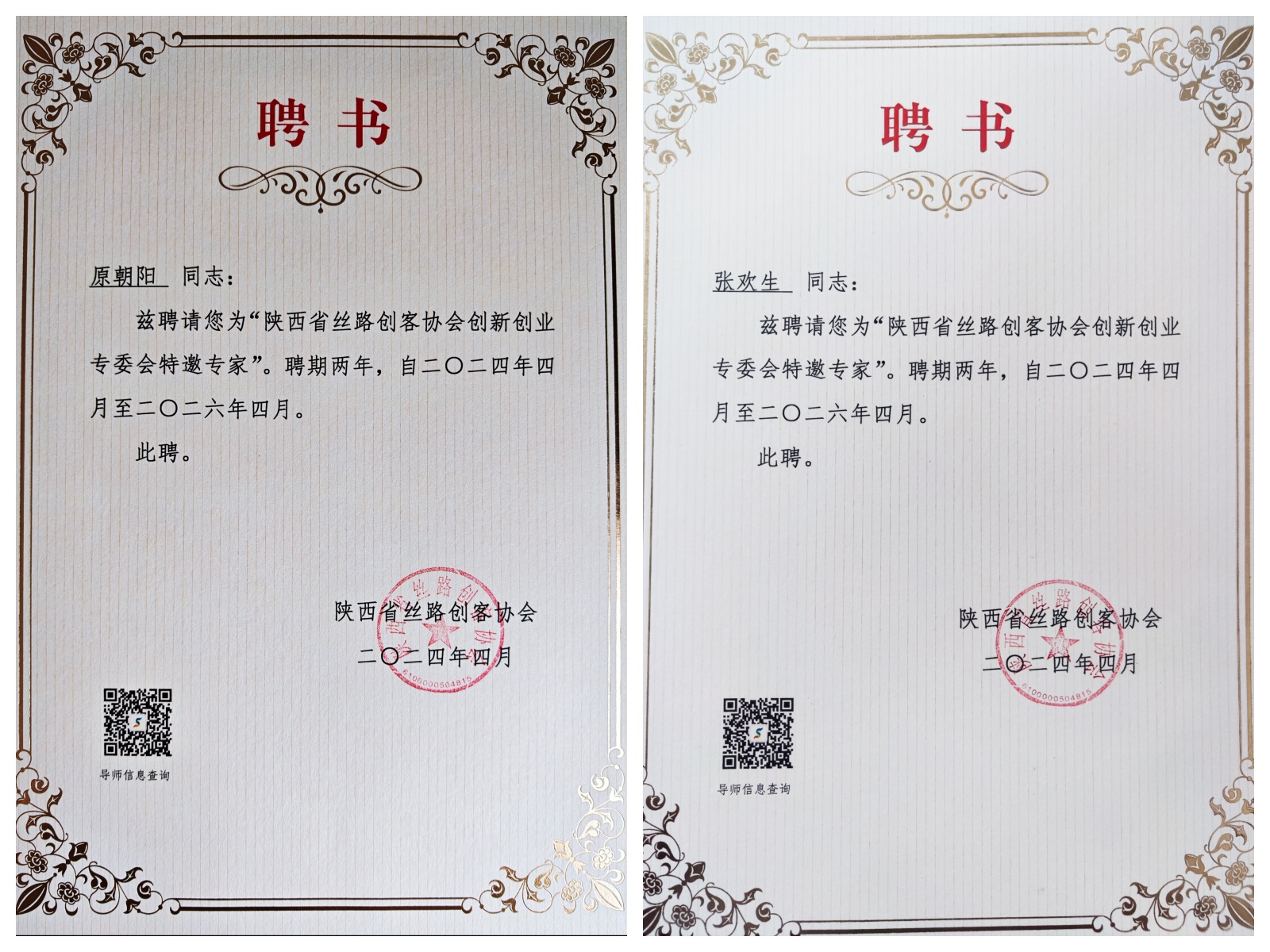 2024年4月19日上午,第五届中国人工智能机器人大会2024陕西省丝路创客大赛暨陕西省创新创业导师聘任仪式在西安浐灞国际会议中心举行,我校2名教师受邀出席了活动。陕西省丝路创客协会执行会长许培等为2024年陕西省创新创业导师代表颁发了聘书,我校人文学院党总支副书记、副院长原朝阳,产教融合与实践教学中心主任张欢生被聘请为“陕西省丝路创客协会创新创业专业委员会特邀专家”。