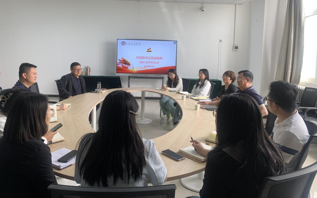 为进一步贯彻落实习近平新时代中国特色社会主义思想和党的二十大精神,进一步加强党组织建设,提高党建工作质量,推进党纪学习教育工作,校党委书记田伏虎、副书记杨红雨于2024年4月23日下午3:30在实验楼301会议室开展信息工程学院党建督查工作会,信息工程学院党总支书记李恒、副书记张琳、统战委员王飞及全体党支部书记参会。