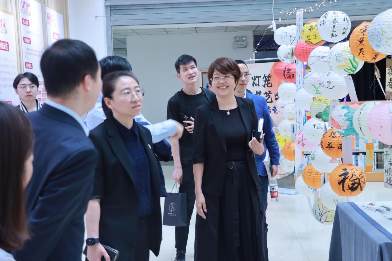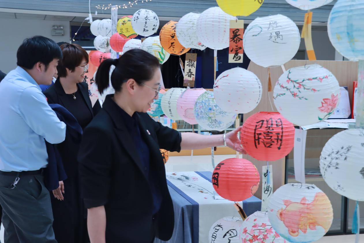 开幕式结束后大家在图书馆二楼中庭参观灯笼书艺会--书法比赛的成果展。