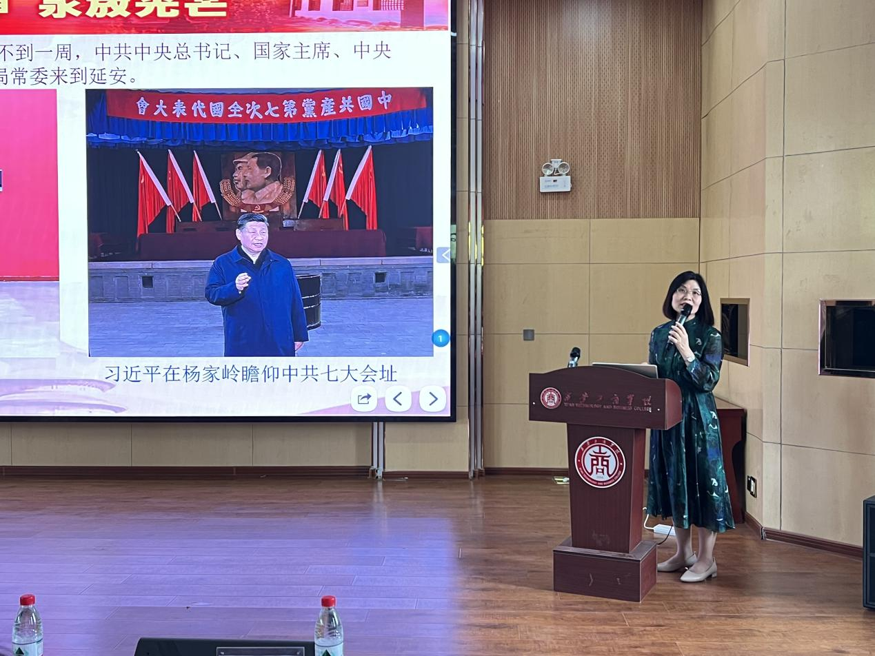 张秀丽副教授以“英明的抉择,伟大的胜利”——党中央、毛泽东转战陕北的历史意义为切入点,张教授扎实的学术功底、宽广的学术视野、深厚的党史党建知识储备,详细讲述了党中央在延安的十三年,从转战陕北的背景、转战陕北的历程、转战陕北几次重大抉择、转战陕北的历史意义四个方面进行系统阐述。