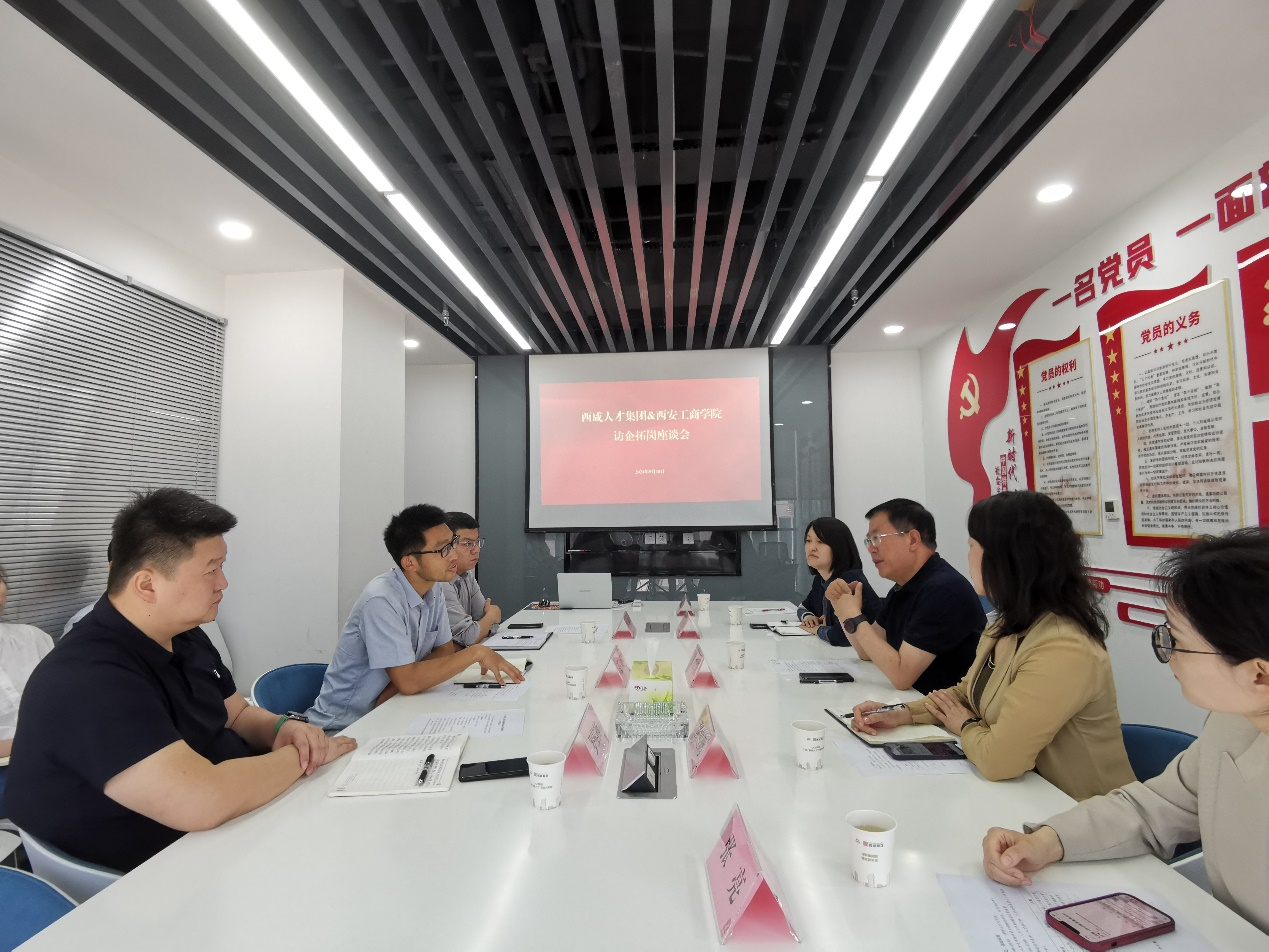 我校田伏虎书记一行人受到了西咸人才集团相关人员的热情接待。在座谈会上,田书记首先介绍了西安工商学院的发展史,并对学校目前在校生、专业建设以及产教融合等相关情况进行了详细说明。田书记表示,希望通过走访的方式,了解社会、企业最需要的人才,根据实际情况,建立起人才培养和人才输送的长效机制,在毕业生就业方面,精准对接校企双方需求,在校企联合、科研攻关、学生就业实习等方面携手共进、共同发展,在这其中,西咸人才集团是高校与企业之间的重要桥梁,可以缓解目前关于人才供需存在的相关问题,期盼双方未来可以加深合作空间。张雪鹏院长对西安工商学院经济与管理学院现有校企合作项目以及学院规模以及开设专业等具体情况进行了进一步具体介绍。张院长表示与人才集团的合作可以助力高校了解市场需求,从而及时调整人才培养方案以达到推动高校毕业生就业高质量发展的目标。西咸人才集团董事长王斐首先感谢西安工商学院对于西咸人才集团的信任,其次对集团的发展历史、组织架构等情况进行了介绍。西咸人才集团副总经理罗佳楠对集团近期设立的“秦创原商学院”以及“订单班”等人才培训体系进行了具体的介绍,期待与西安工商学院之间搭建人才输送桥梁。本次座谈会,双方就如何进一步加强校企合作、推进产教融合、提高人才培养质量等方面达成了初步共识。