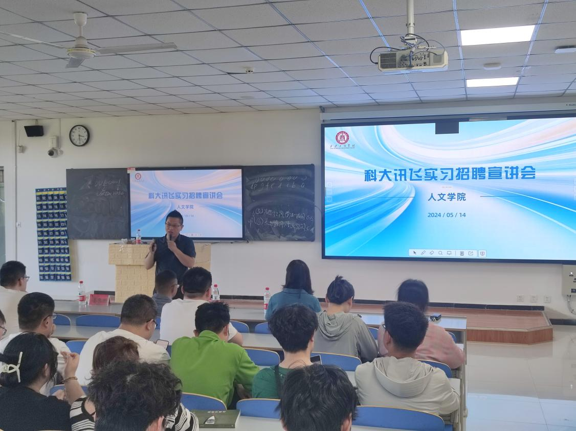 为继续深化校企合作,积极拓展我院学生实习就业渠道,建用人单位和毕业生的双向选择平台。5月14日下午,人文学院邀请科大讯飞股份有限公司于教学楼2-113举办“2025届毕业生实习招聘宣讲会”。科大讯飞生态公司总经理秦佛刚、核心研发平台校企合作组总监成程、人文学院教学副院长原朝阳、学工副院长范诚梅、产教融合与实践教学中心主任张欢生、科员苗力元、2021级网络与新媒体和汉语言文学的全体学生及带班辅导员参会。