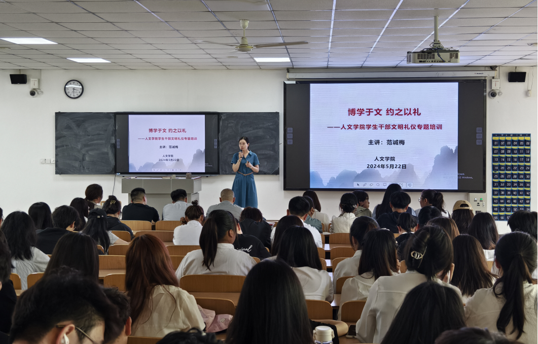 “博闻强识而让,敦善行而不怠,谓之君子”。为了全面提升人文学子的思想道德素质和文明礼仪修养,构建更加和谐的校园环境,人文学院于5月22日举办了学生干部文明礼仪专题培训。本次培训由人文学院学工副院长范诚梅老师主讲,全体学生党员、学生干部及入党积极分子参与了活动。