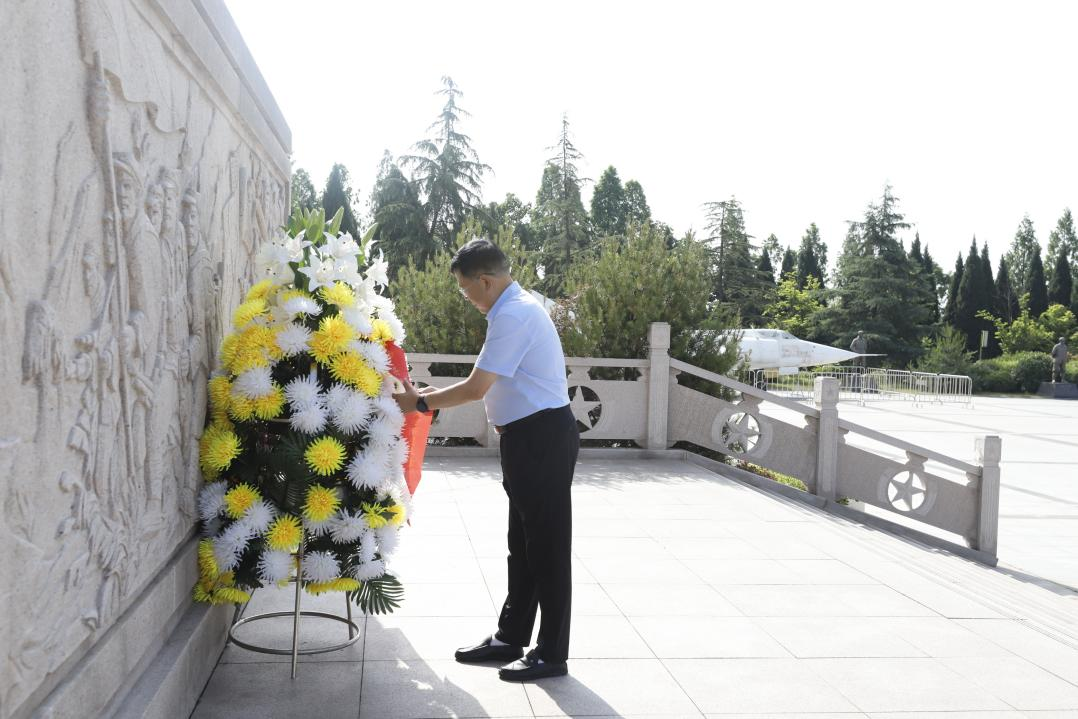 扶眉战役烈士纪念碑前,气氛庄严肃穆。全体人员在纪念碑前列队肃立,齐声高唱中华人民共和国国歌。随后,全体人员脱帽,向烈士默哀。伴随着《献花曲》,两名党员代表稳抬花篮、徐徐前进,向扶眉战役烈士纪念碑敬献花篮。党委书记田伏虎神情庄重,缓步拾阶走向敬献的花蓝,仔细整理挽联,带领全体人员向纪念碑三鞠躬,深切缅怀革命先烈的丰功伟绩和崇高精神。