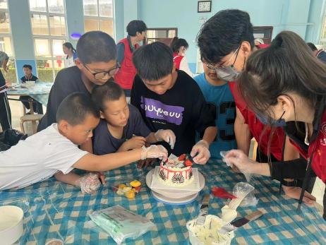 合影留念后,志愿者们将“六一爱心礼包”送到孩子们的手中,并送上节日祝福,给予孩子们温暖和力量,点亮他们成长的道路。孩子们带着惊喜和感动接过礼物,脸上洋溢着幸福的笑容。在欢声笑语中,孩子们开始了DIY蛋糕制作。在甜点师傅和志愿者的共同指导下,孩子们认真制作着专属于自己的蛋糕,用一朵朵奶油花瓣、各种水果、饼干点缀在自己的蛋糕上,完成了一个个充满创意的蛋糕作品,其乐融融。孩子们在动手实践中不仅学会了新技能,还从中获得了前所未有的快乐!随后,在林宝馨院长带领下,志愿者与孩子们进行互动交流。讲解员小朋友带领志愿者们参观儿童之家,介绍儿童之家的生活起居、学习环境和活动场所。