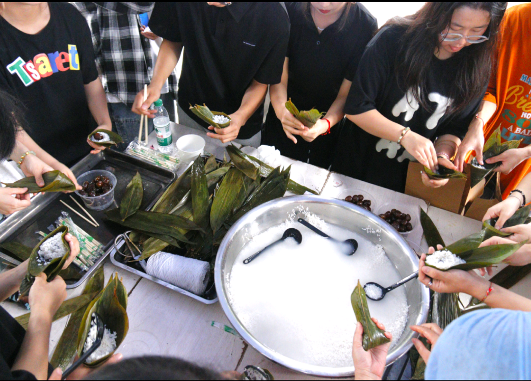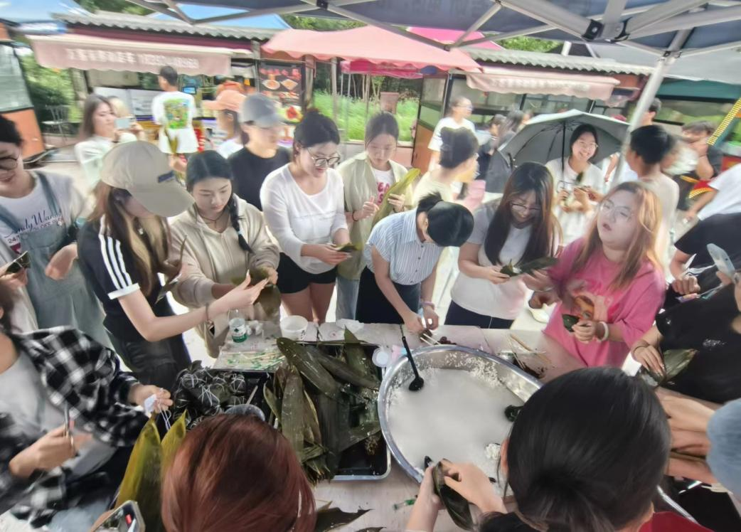 “端午临中夏,时清日复长。”包粽子成为此次美食节的亮点之一。同学们纷纷围观学习,亲手学习制作传统的端午节粽子,体验包粽子的乐趣与独特技巧。先将粽叶折成一个漏斗型,放上糯米,用粽叶把米包裹住,最后用棉线扎紧。食堂阿姨手把手教学生包粽子。虽然初次尝试的粽子大小不一、形态各异,但是每个人都沉浸在自己动手的乐趣中。