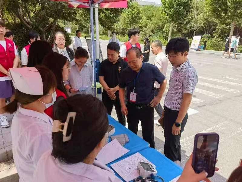 与此同时,在我校柳湾公寓南侧开展无偿献血活动。讲座结束后,各参会领导前往献血现场参观指导。