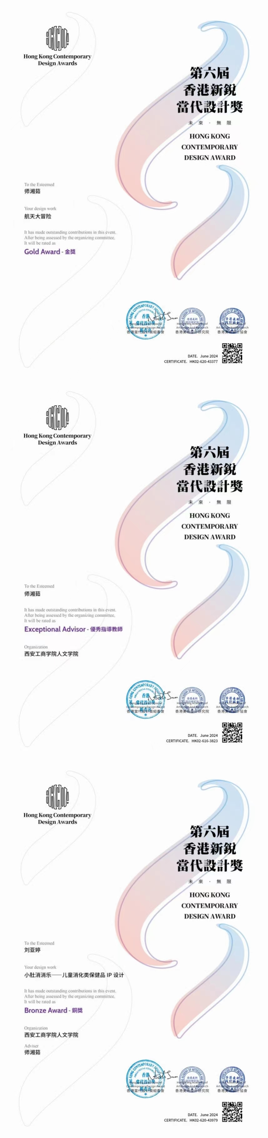 2024年6月27日,在设计界备受瞩目的第六届香港当代设计奖(春季赛)评审结果揭晓,西安工商学院人文学院专职教师兼新闻传播系教工党支部书记师湘茹创作的作品《航天大冒险》荣获金奖,21级网络与新媒体专业学生刘雅婷(指导教师:师湘茹)作品《小肚消消乐》荣获铜奖。