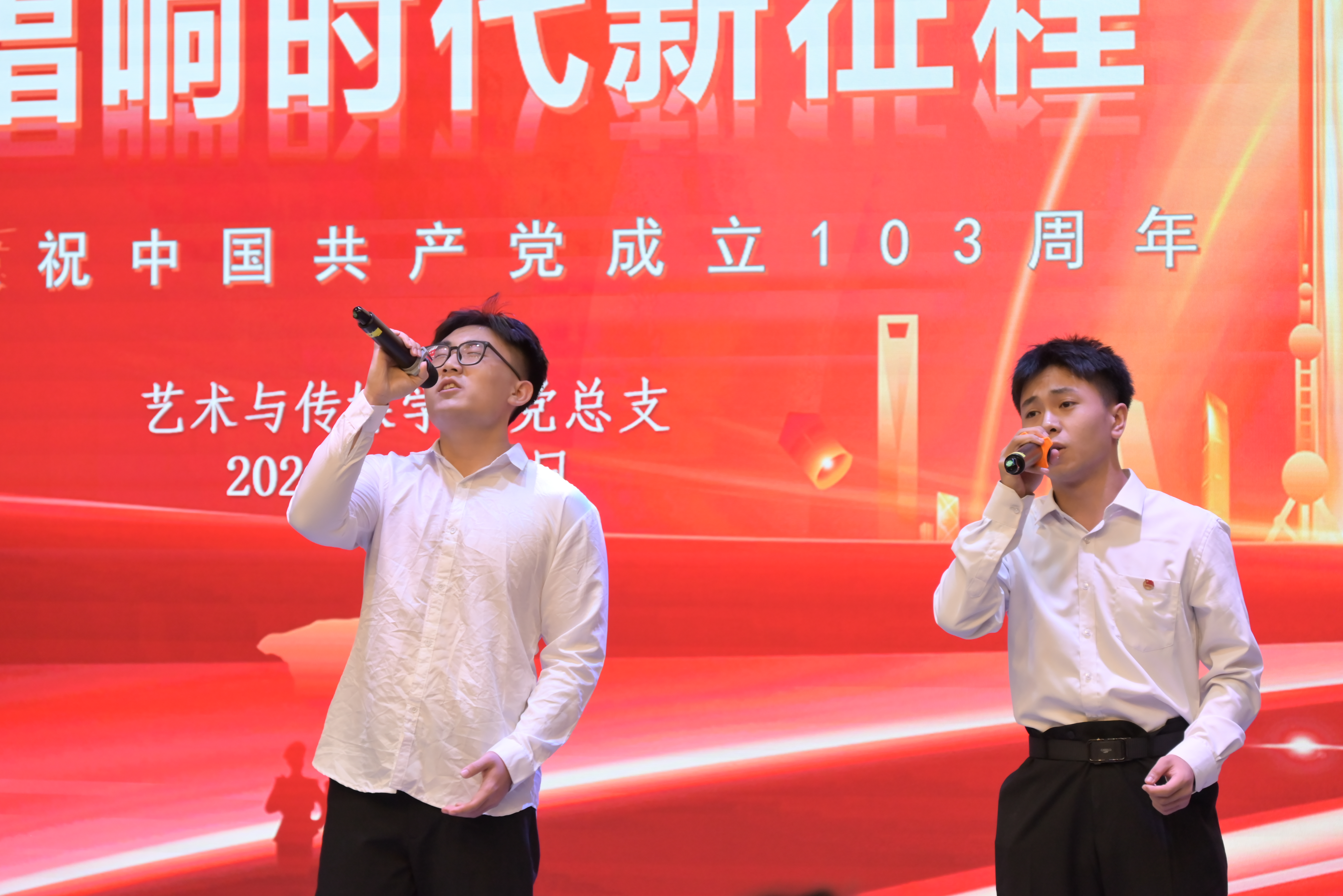 为庆祝中国共产党成立103周年,引导广大党员铭记党的光辉历程,激励广大党员踔厉奋发、赓续前行,增强党组织的凝聚力、战斗力、创造力,6月27日晚,艺术与传媒学院党总支举办了“艺心向党庆七一,唱响时代新征程”庆祝建党103周年主题党日活动。学院党总支组织委员、学生第一党支部书记孙诗睿,学生第二党支部书记高瑜,各支部党员、发展对象、积极分子代表参加了活动。