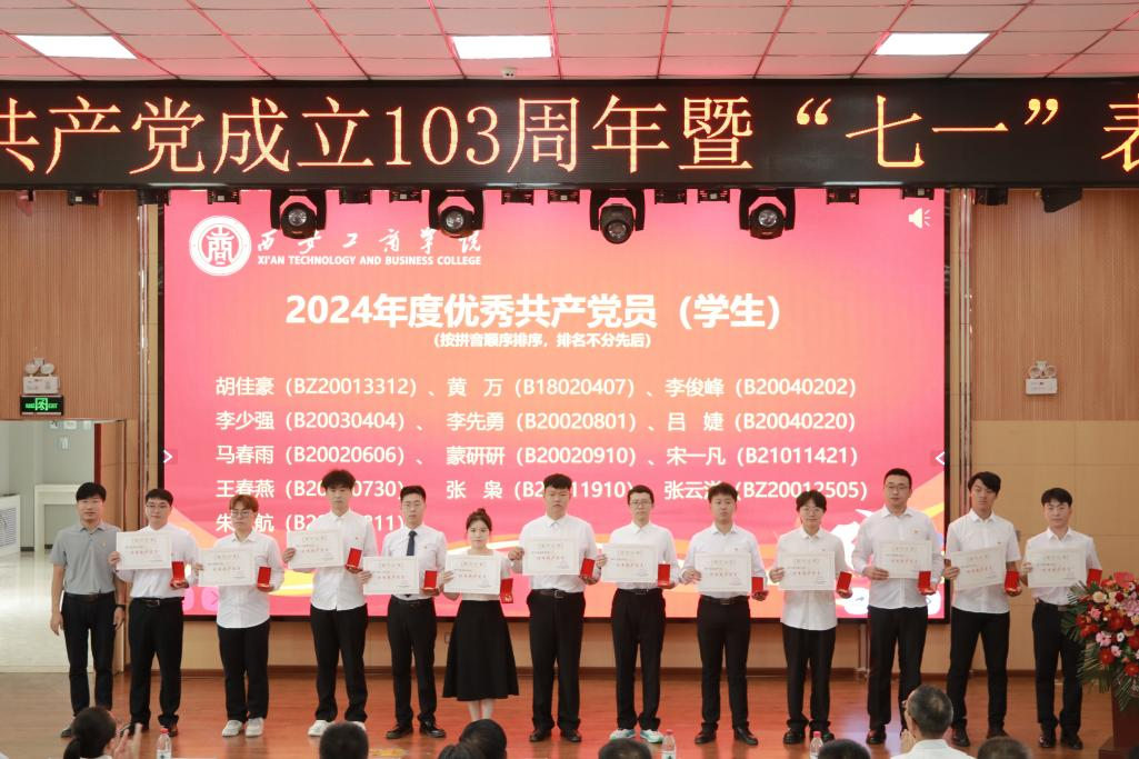 党委副书记、纪委书记杨红雨宣读中共西安工商学院委员会《关于2024年度党内优秀表彰的决定》、《关于“学党规党纪 明校史校情 促担当作为——西安工商学院第一届党史校情知识竞赛”表彰的决定》、《关于西安工商学院党纪学习教育知识测试组织情况表彰的决定》、《关于公布党建“双创”工作建设单位和党员示范岗的通知》。