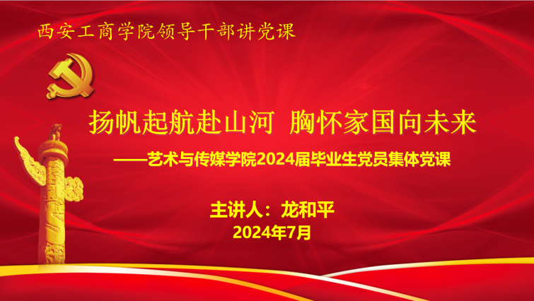 为进一步加强毕业生党员理想信念教育,引导毕业生党员坚定不移听党话、跟党走,争做堪当民族复兴重任的时代新人,7月3日上午,在图书馆四楼党建会议室,副董事长、常务副校长龙和平同志以《扬帆起航赴山河,胸怀家国向未来》为主题,为艺术与传媒学院毕业生党员上了离校前最后一堂生动的党课。