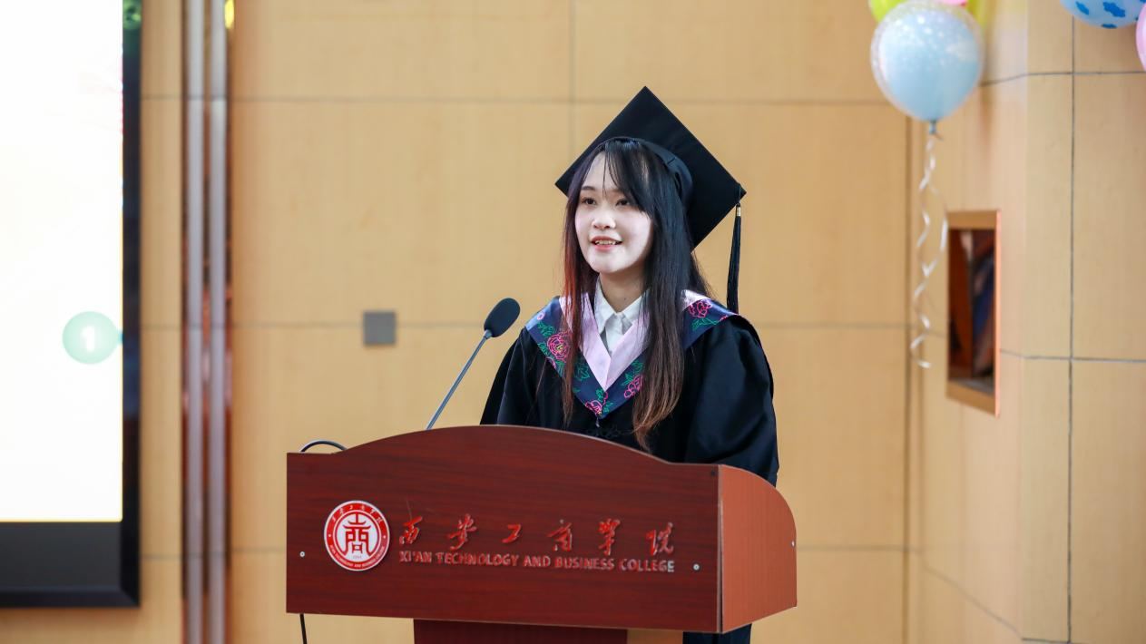 毕业学生代表王潇湘同学发表毕业感言。她回顾了自己大学四年的成长历程,从初入校园的懵懂,到泮池边的每日练声,每次都课堂教学,到每一次实践活动的历练,到每一次参加学科竞赛的准备,图书馆苦读,充分表达了对学院培养和老师教诲的感谢,更表达出对未来美好生活的憧憬和向往。她祝福毕业生们勇敢前行、迎接挑战、为梦拼搏,为校争光。