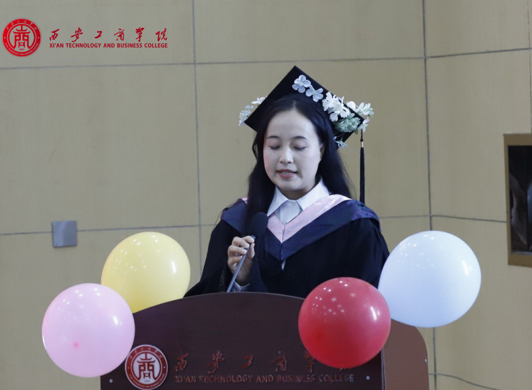 优秀毕业生田琴琴作为学生代表发言,她表示青年要立大志、明大德、成大才、担大任,身当百川之流,胸纳天下之心,带着对母校的爱,对生活的爱,踏浪前行,紧跟一代又一代先驱者的步伐,成为国家和社会需要的建设者,为中华之浩浩前程贡献青春力量。