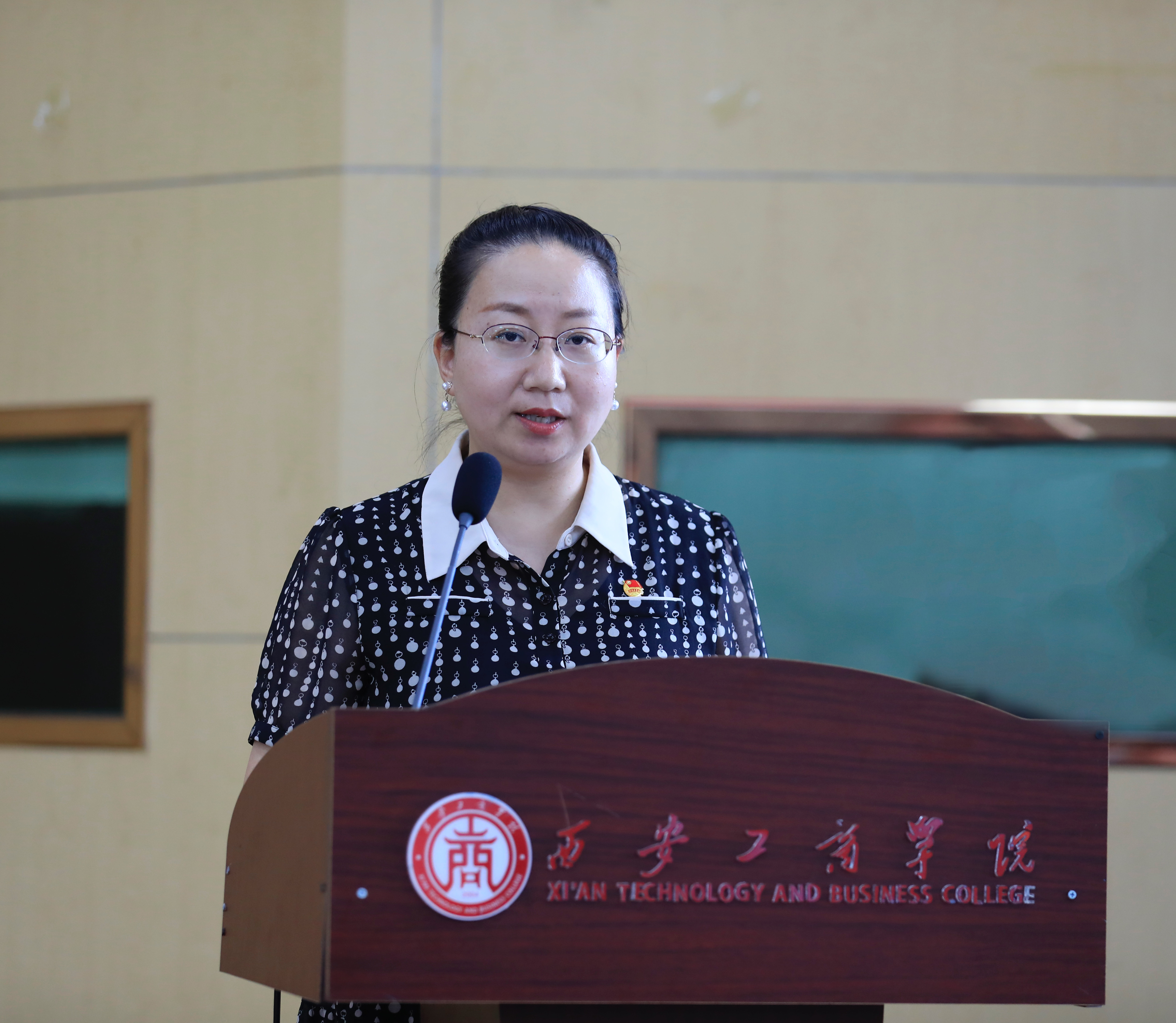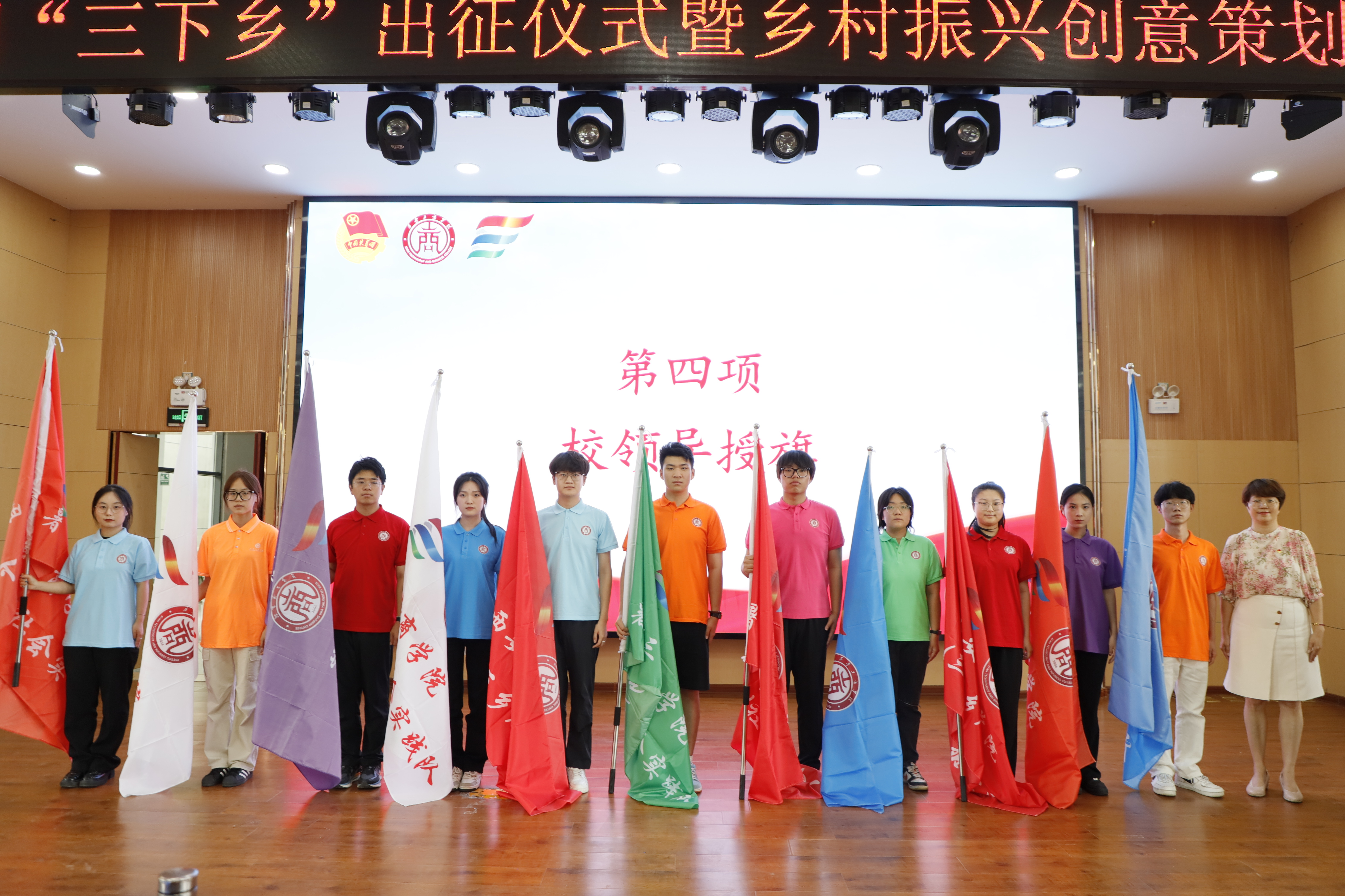 西安工商学院党委副书记杨红雨向社会实践团队授旗。