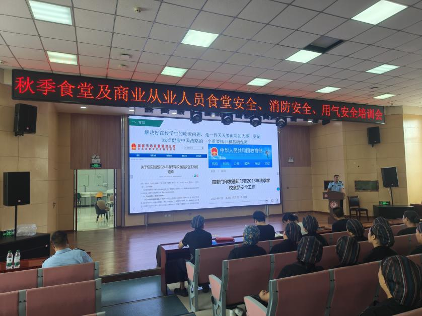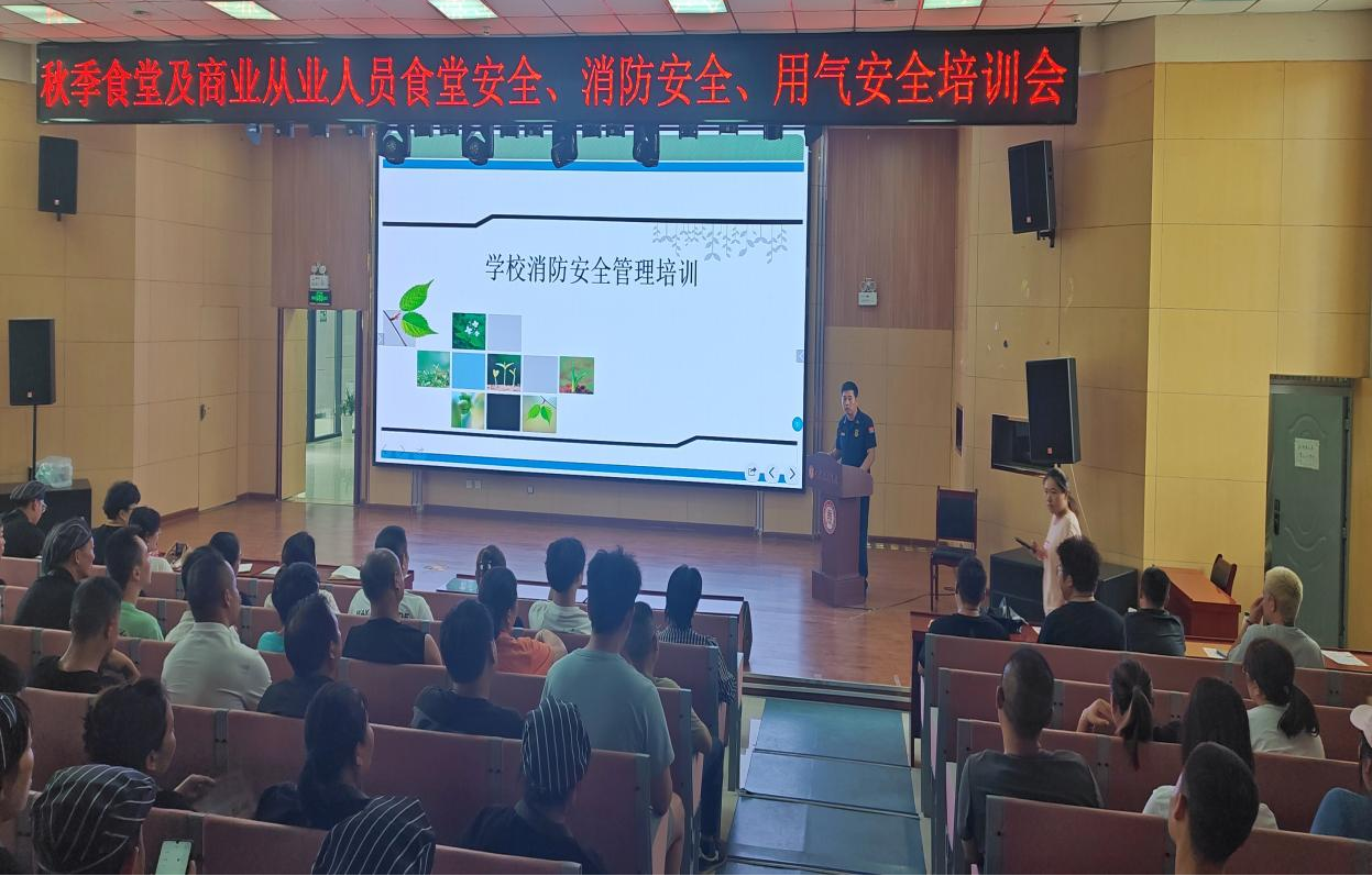 2024年8月23日下午,后勤保卫处邀请高陵区市场监管局食品科党科长、城区监管所杨所长、孔老师、高陵区消防救援大队刘工程师、玉祥天然气公司相经理一行五人,在学术报告厅开展食堂及商业从业人员食品安全、消防安全、燃气安全培训。食堂从业人员、食品经营承包商、商业从业人员及后勤保卫处相关工作人员参加培训。