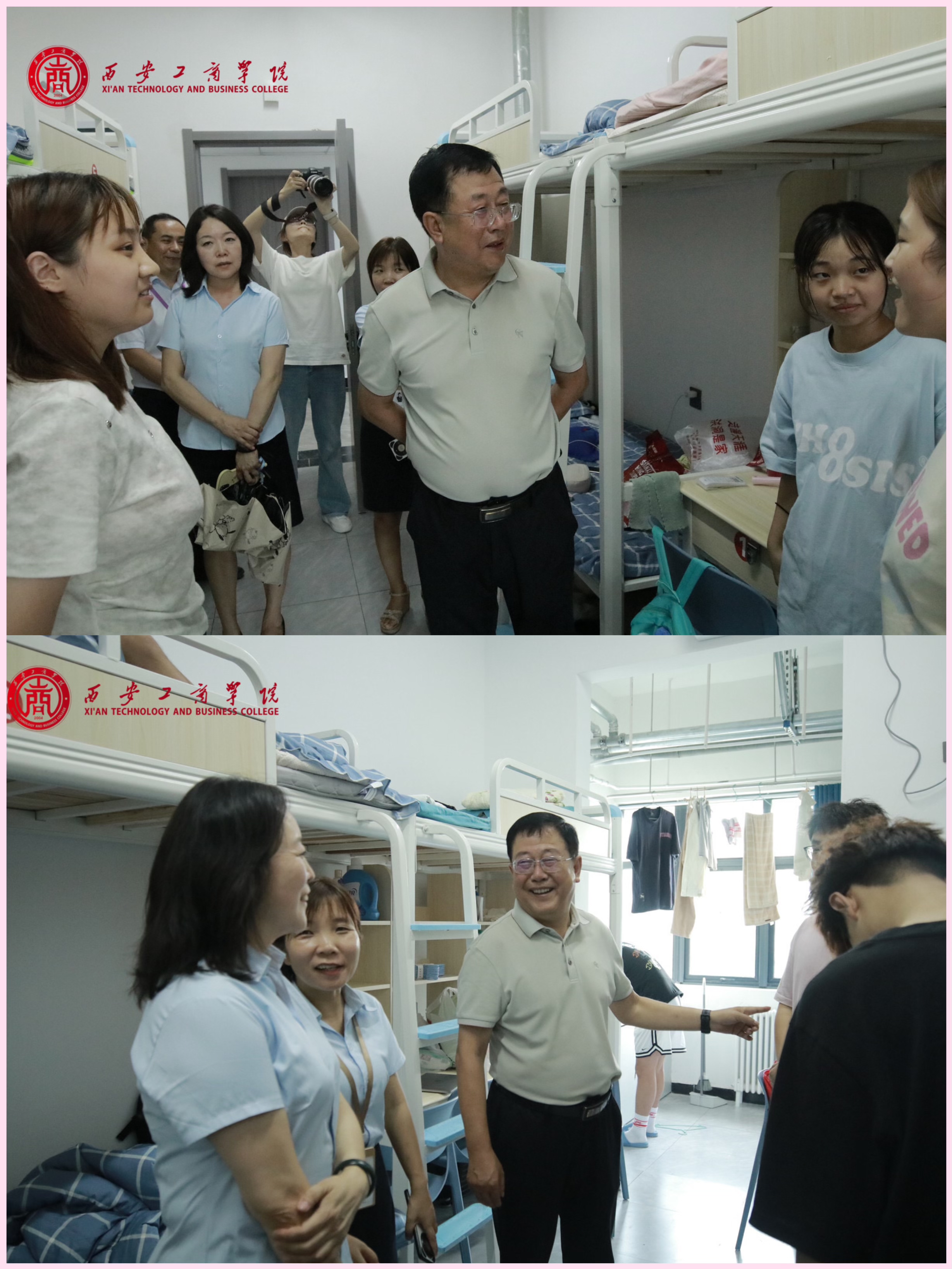 随后,西安工商学院党委书记、督导专员田伏虎带队,经济与管理学院院领导陪同前往宿舍看望新生,与新生、家长进行亲切交流,听取新生们在生活、学业等多方面的感受和需求,为新生们送去热切的关心和问候。