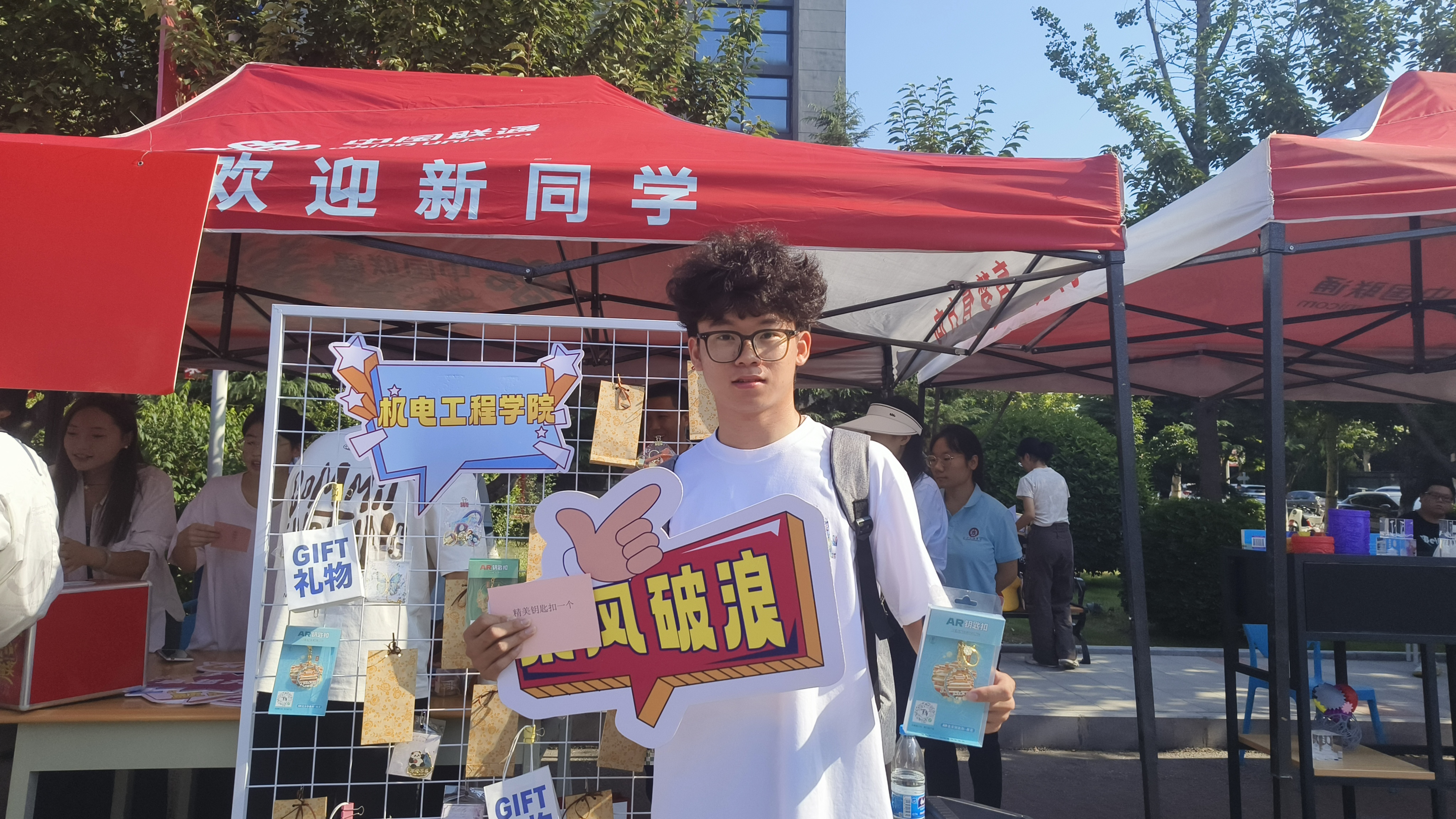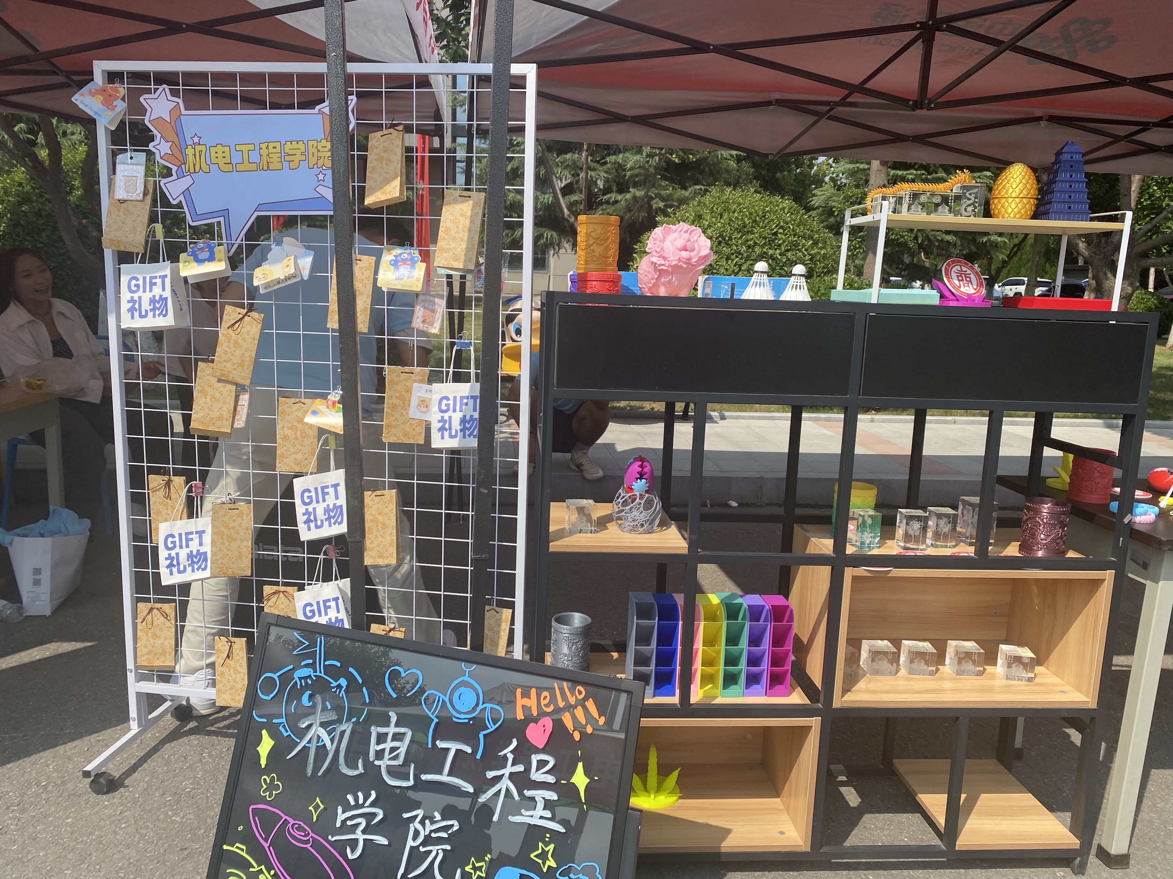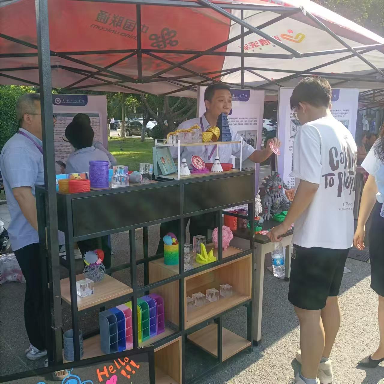 接下来,机电工程学院还特别设置了温馨的咨询区域,为远道而来的新生及家长精心打造了一处休憩与交流的空间。学院细心地准备了凉棚以遮阳避暑,配备了舒适的凳子和清凉的水,以及实用的扇子,让家长们在炎炎夏日中感受到一丝惬意的凉爽。此外,学院还贴心地安排了专业老师驻守咨询点,随时准备为家长们解答关于学院、专业及学习生活的各种问题,让家长们在等待办理手续的过程中,既能安心休息、轻松聊天,又能深入了解学院情况,这份细致入微的关怀无疑为家长们送去了心灵的温暖。同时,机电工程学院为新生们准备了精心挑选的小礼物,旨在让每一位新同学在踏入校园的第一刻就能感受到家一般的温馨与学院的热情好客。更令人兴奋的是,学院还策划了惊喜抽奖环节,让每位新生都有机会获得一份神秘而丰厚的大奖,这份意外的喜悦无疑为新生的大学生活添上了浓墨重彩的一笔,充分体现了学院对新生的热烈欢迎与美好祝愿。咨询区内,除了优质的服务与咨询,还设有专业的学院介绍板块和机电工程学院特色活动的展示区。其中,3D打印模型的精彩展示尤为引人注目,成为了校园里一道亮丽的风景线,吸引了众多家长与学生驻足观看、咨询交流,不仅展现了学院在科技创新方面的实力与成果,也进一步激发了新生们对未来学习生活的憧憬与期待。