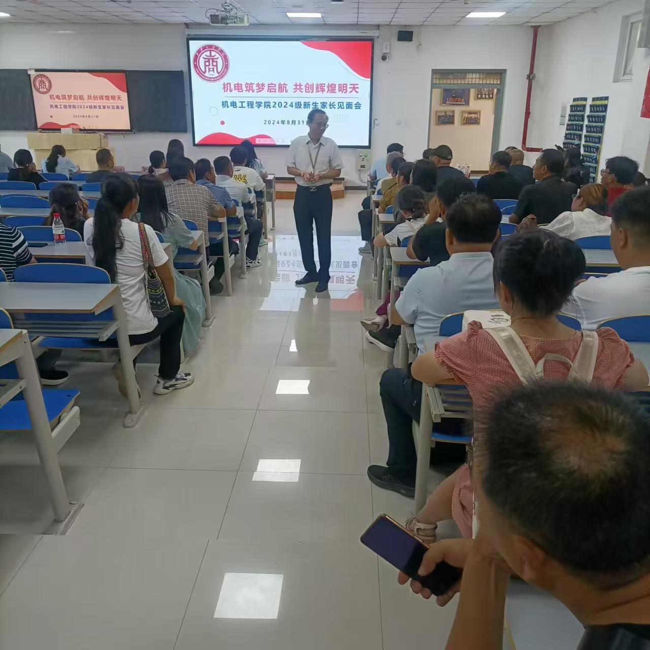 接下来就是家长会的环节了,机电工程学院的院领导对此高度的重视,机电工程学院院长任工昌,执行院长韩娟,学生院长罗艳,教学副院长薛凤凤及各系教研室主任共同出席了本次活动。会上,院长任工昌教授向各位家长致以诚挚的问候和祝福,表明教育是一项神圣而伟大的事业,我们每一个人都肩负着培养未来人才、传承知识文化的使命。在这个充满变革和创新的时代,要不断提升自身素质,积极探索教育教学改革之路,努力打造一流学科、一流团队、一流成果。机电工程学院执行院长韩娟给家长做了详细的汇报,介绍了学校的发展愿景,机电工程学院的基本教师情况,机电工程学院的专业和课程情况、产教融合情况、就业情况、学院的建设路径和昕睿班的具体情况。内容完整且详细,条理清晰,家长听得非常认真,同时通过家长的表情,能够看出对学院和学校的满意。会议结束后,众多家长仍意犹未尽,纷纷主动与学院领导及各位主任进行深入交流,展现出对学院教育环境及孩子未来发展的深切关注与期待。本次家长会取得了圆满成功,家长会是一个让家长了解学校教育理念、教育环境、课程设置,培养方向以及与老师和其他家长交流的绝佳机会,也是让家长将学生放心交给学校的一个重要环节,不仅加深了家校之间的沟通与理解,更为双方携手合作、共同为孩子们铺设一条通往美好而充实未来的道路奠定了坚实的基础。