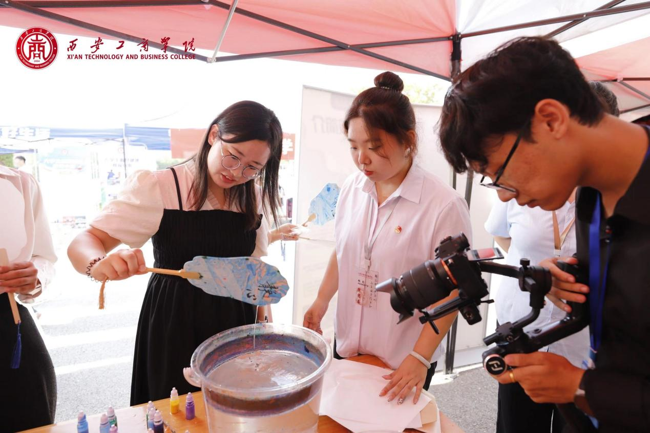 人文学院还在咨询区组织了非遗传承漆扇制作活动,在志愿者的解说下,参加活动的新生们了解到漆扇的历史渊源、制作流程,用心学习绘制技法。选取颜料,倒入水桶,搅拌均匀,把扇子放进桶内染色,最终制成一把“独一无二”的漆扇。同学们在漆扇制作的过程中,也亲身体验到了中华传统文化的深厚底蕴,为传统文化的繁荣与发展注入了新的青年活力。