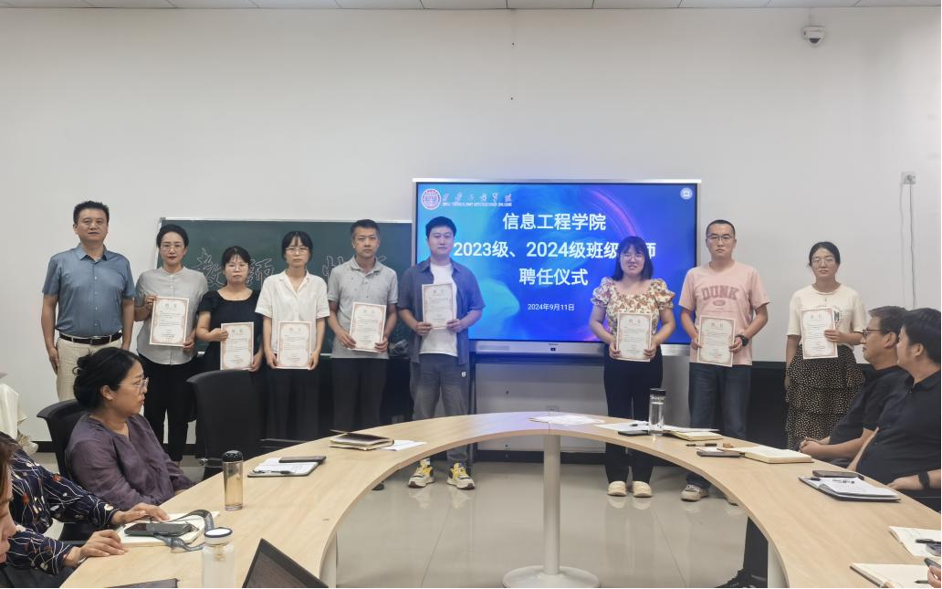 为进一步推动班级管理和学生成长,提升学院教育质量,信息工程学院于9月12日在实验楼301会议室举行了2023级、2024级班级导师聘任仪式。本次仪式旨在通过聘任优秀教师担任班级导师,促进学生全面发展,增强班级凝聚力,为未来的学业与职业生涯打下坚实基础。信息工程学院执行院长张琳、信息工程学院党总支书记、学工副院长李恒、信息工程学院教学副院长王飞以及全体新聘任的班级导师出席了本次活动。仪式由信息工程学院教学副院长王飞主持。