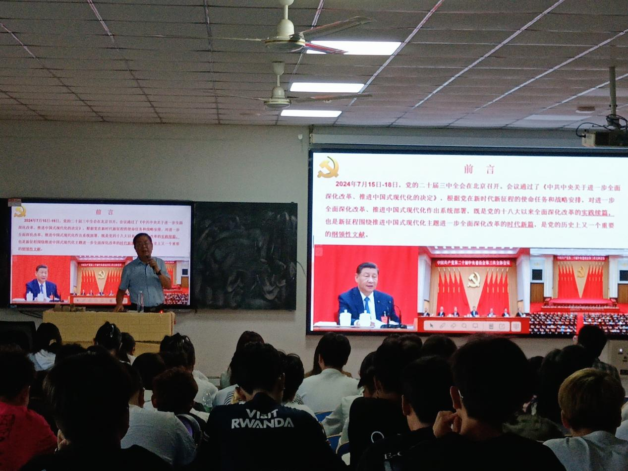 田书记向同学们逐一讲述了改革开放以来党推进改革的重大决策部署,并再一次强调我们要深刻认识党的二十届三中全会的主题和意义,会议通过了《中共中央关于进一步全面深化改革、推进中国式现代化的决定》,根据党在新时代新征程的使命任务和战略安排,对进一步全面深化改革、推进中国式现代化作出系统部署,既是党的十八大以来全面深化改革的实践续篇,也是新征程围绕推进中国式现代化主题进一步全面深化改革的时代新篇,是党的历史上又一个重要的纲领性文献。田书记说,作为新时代的大学生,要深刻认识进一步全面深化改革的指导思想、总目标和重大原则,同时围绕继续完善和发展中国特色社会主义制度、推进国家治理体系和治理能力现代化的总目标,全面准确理解《决定》提出的进一步全面深化改革的一系列重大举措。