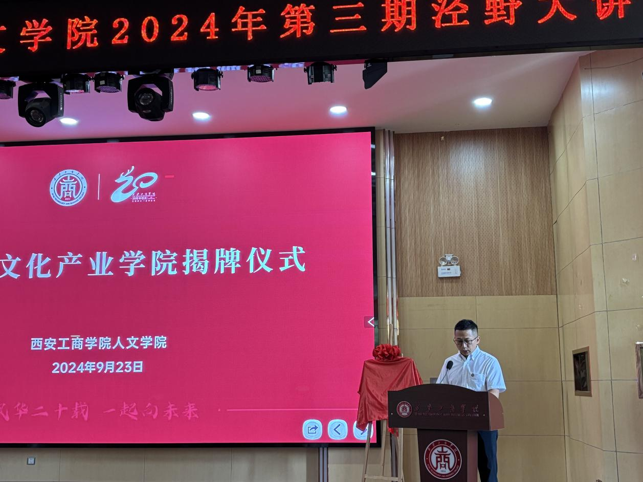 为深入贯彻落实党的二十大全会精神和《国务院办公厅关于深化产教融合的若干意见》(国办发〔2017〕95号),积极探索推进产教融合的新路径要求,9月23日,西安工商学院人文学院在学术报告厅成功举办新视域文化产业学院揭牌仪式暨人文学院2024年第三期泾野大讲堂。陕西学前师范学院文学院院长牛文明教授,新视域文化产业学院负责人王妙笛,西安工商学院人文学院院长,学院党总支副书记、副院长原朝阳,产教融合与实践教学中心主任张欢生、中文系主任许晶晶及中文系师生代表参加了本次活动。活动由原朝阳主持。