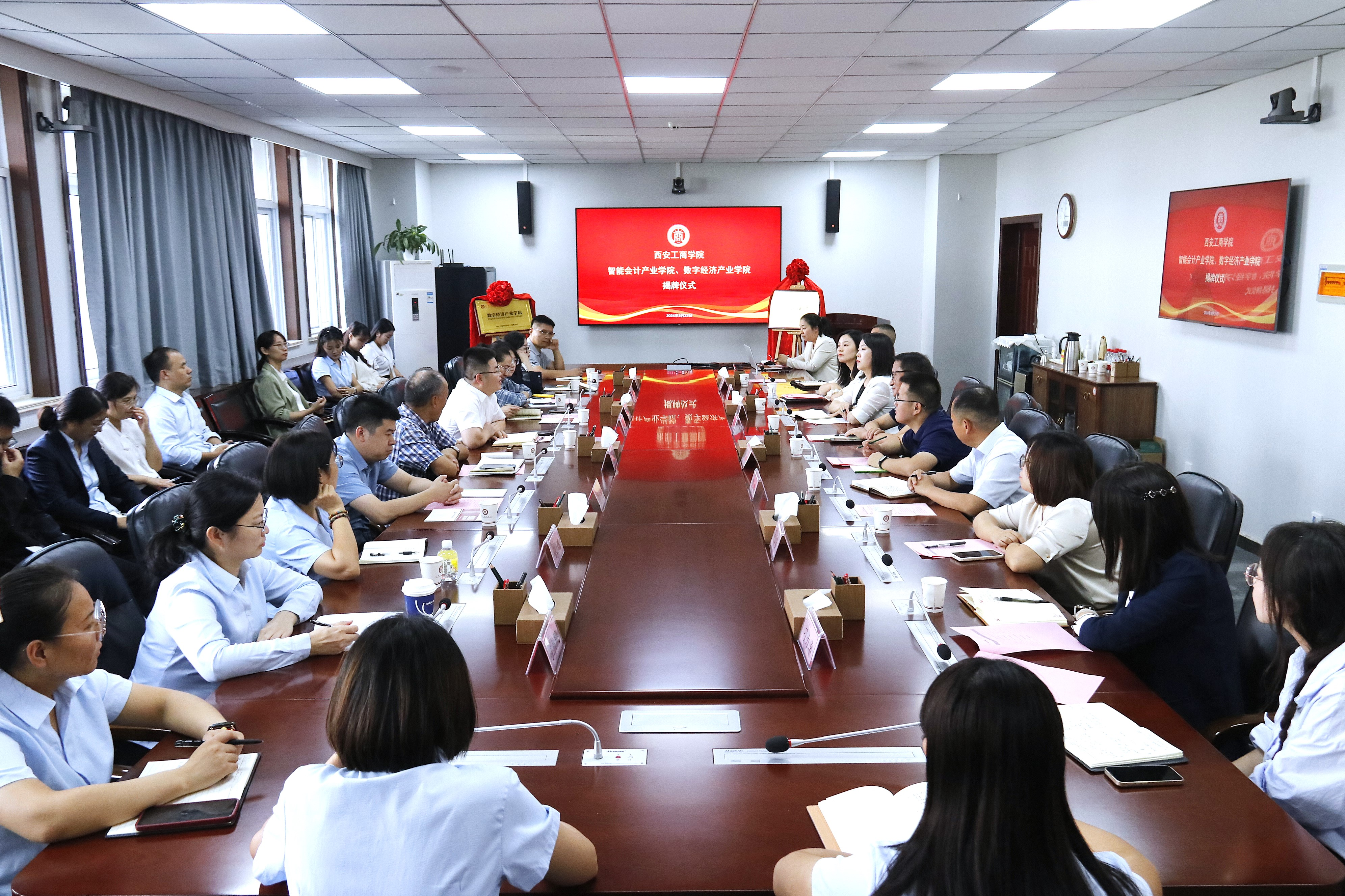 为推动教育与产业深度融合,创新应用型人才培养模式,9月23日下午,西安工商学院成功举办了智能会计产业学院、数字经济产业学院揭牌仪式。西安工商学院副董事长、常务副校长龙和平,西安工商学院副校长杨欣欣,原哈尔滨师范大学经济学院院长、三级教授过仕明,中国建设银行股份有限公司西安高陵区支行行长佘俊,金隽(陕西)教育科技有限公司总经理王良,智能会计、数字经济产业学院负责对接老师宋扬,哈尔滨广厦学院商科产业学院负责老师张居虎出席会议。西安工商学院经济与管理学院执行院长张雪鹏,西安工商学院经济与管理学院院长助理郭鹏,西安工商学院财务处副处长左斌,经济与管理学院系主任、产教融合与实践教学中心主任及专职教师代表参加会议,会议由创新创业学院院长伍建文主持。