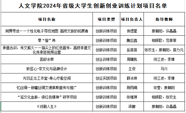 人文学院自接到关于大学生创新创业训练项目申报的通知,积极组织动员学生进行项目申报,共有11个项目,70名学生参与了此次项目申报,经过学院筛查、学校评审及推荐,最终9个项目获得2024年陕西省大学生创新创业训练计划项目立项。