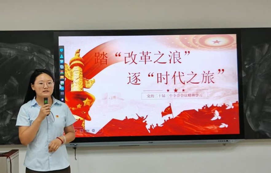 学生第二党支部书记高瑜老师以《踏“改革之浪”,逐“时代之旅”》为题,深刻阐述了党的二十届三中全会的重要意义。她强调这次全会是在以中国式现代化全面推进强国建设、民族复兴伟业的关键时期召开的一次十分重要的会议。站在新的历史起点上,会议对进一步全面深化改革、推进中国式现代化作出了战略部署,彰显了党不断推进改革创新、为人民谋幸福的坚定决心。