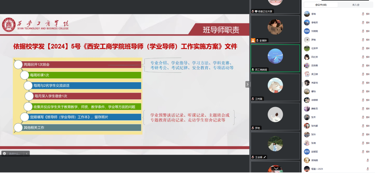 会议主要围绕班导师职责、学籍异动、学业警告、学籍处理以及毕业与学位审核等五个方面展开深入讨论。班导师肩负着重要使命,要收集并反映学生关于教育教学、师资、教学条件、学业等方面的问题。会议还明确了西安工商学院学士学位授予条件以及班导师的工作职责。
