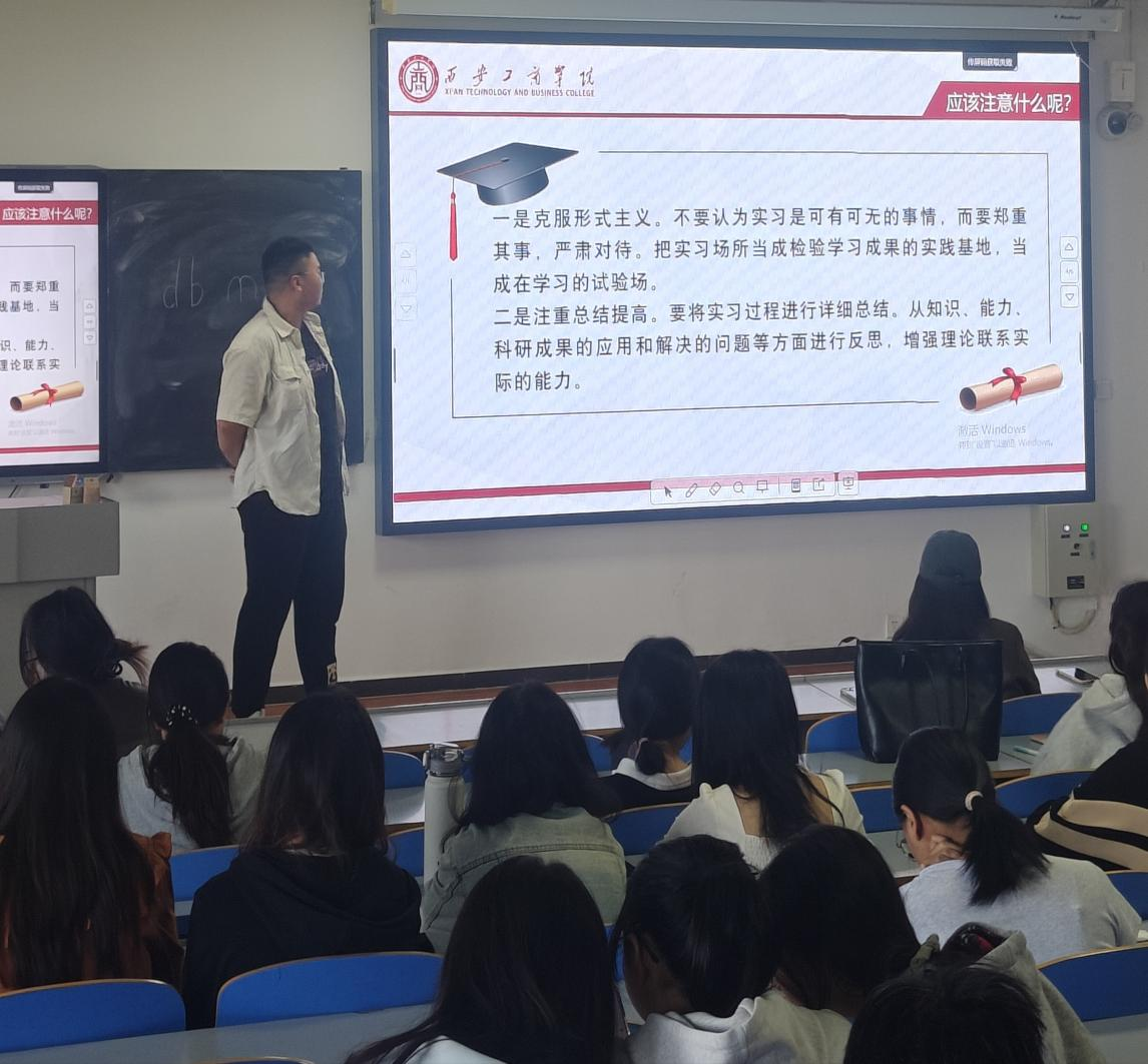 紧接着,辅导员朱婉悦老师围绕“实习安全,重于泰山”的主题,从人身安全、财产安全、交通安全、信息安全、职业安全等多个方面,详细讲解了实习期间可能遇到的安全隐患及防范措施,并向同学们普及了实习相关的劳动法内容。她通过生动的案例分析和实用的应对策略,让同学们深刻认识到实习安全的重要性,并掌握了一定的自我保护技能。