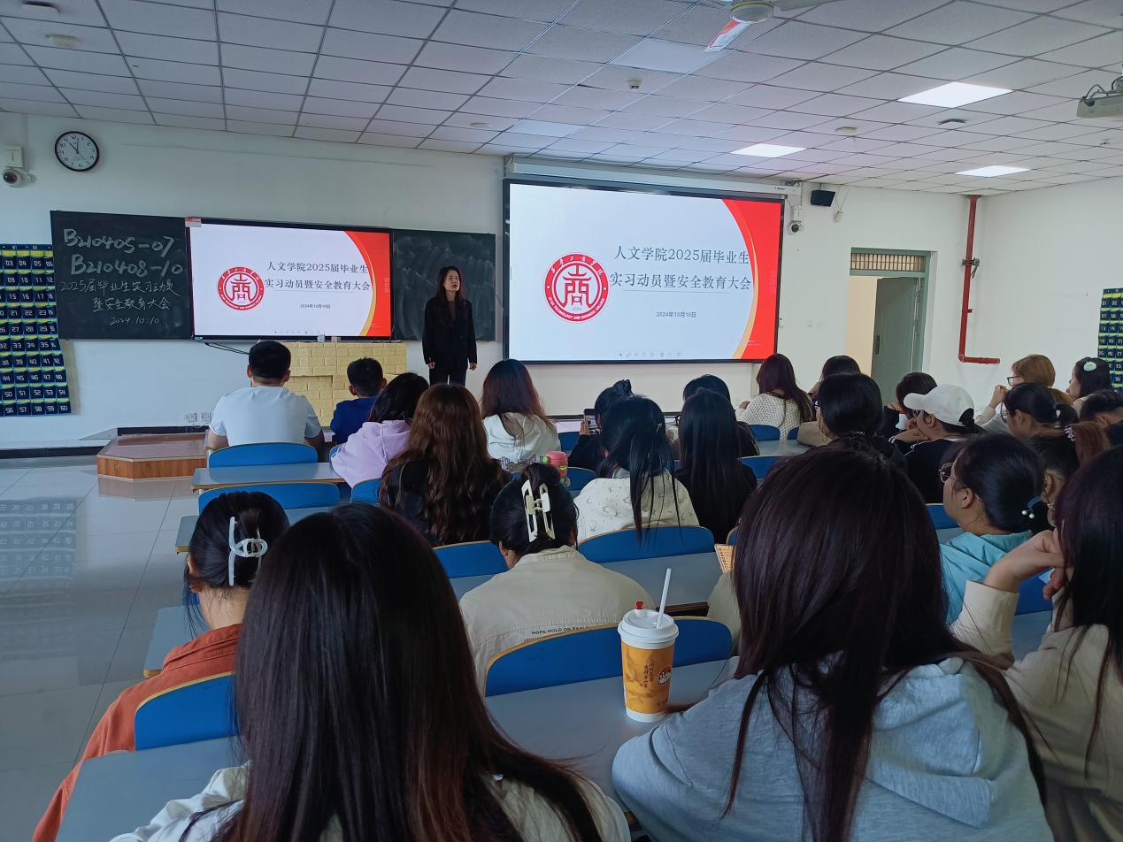为了帮助学生明确校外实习的任务、目标和意义,引导学生做好实习前各项准备工作,同时增强学生实习安全防范意识,10月10日上午,人文学院在2—113教室召开2025届毕业生实习动员暨安全教育大会,人文学院2025届毕业班辅导员老师和全体2025届毕业学生参加了此次会议。