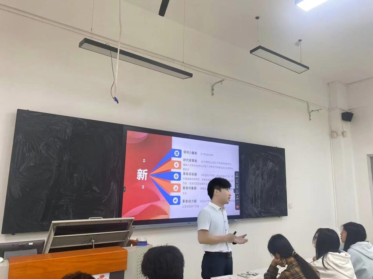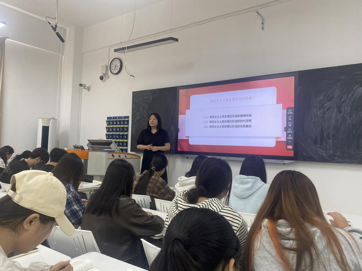 随后,杜潇颖老师接过了课堂的接力棒,她以图文并茂、视频展示等多样化的教学手段,深入阐述了新民主主义革命理论形成的国情依据、时代背景以及实践基础。她指出,新民主主义革命理论是马克思主义中国化的重要成果,是在实践中运用马克思主义的立场、观点和方法,独立自主地分析和研究中国革命实际问题的产物。通过这一理论的学习,同学们更加坚定了为实现中华民族伟大复兴的中国梦而努力奋斗的信念。