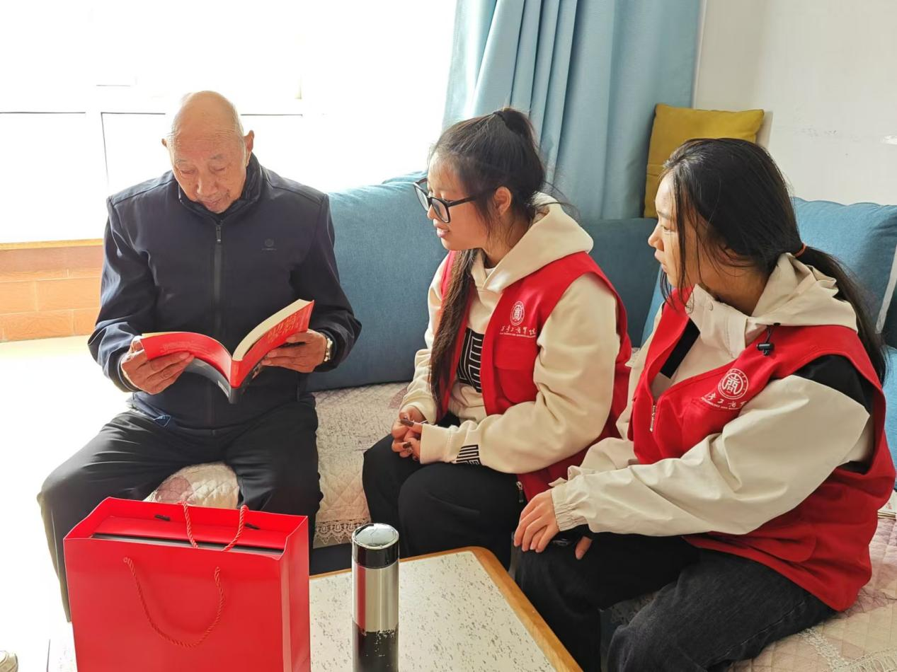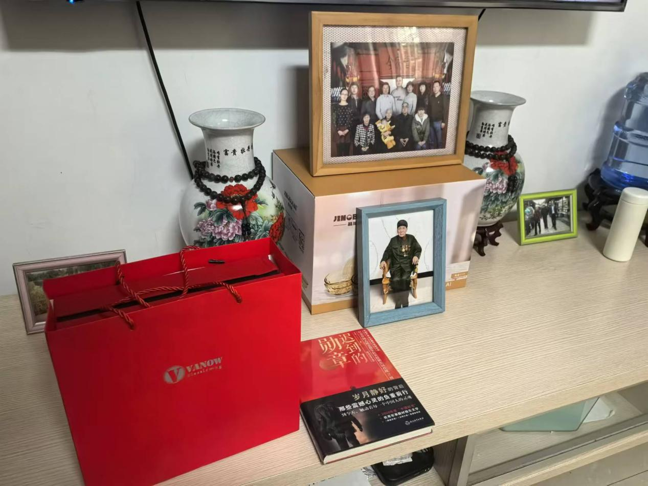 在社区工作人员的引领下,志愿者们前去慰问抗美援朝老兵。慰问之际,志愿者们向老人赠送了慰问品,深切地表达出敬意与感激之情。两位老人虽年事已高,但在讲述抗美援朝战争时期的故事时,依旧精神抖擞、乐观豁达。当学生问道倘若再来一次,是否还会义无反顾地奔赴前线战斗时,老人坚定地表示,无论何时,无论有几次机会,自己都会毫不犹豫地选择保家卫国!看到《迟到的勋章》这本书时,老人说道,奔赴前线打仗并非贪图功名,而是为了国家的发展,为了子孙后代能拥有美好的生活!