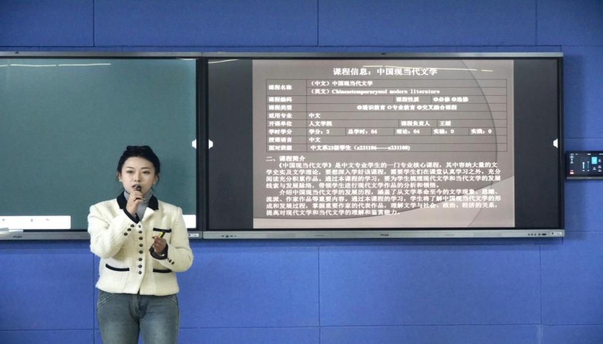 第一位磨课教师王媛对《中国现当代文学》进行讲述,她先以“说课”的形式介绍课程性质、课程目的与教学目标,随后进行微课展示,在15分钟内围绕张恨水的小说进行教学,教学过程包括视频展示等环节。