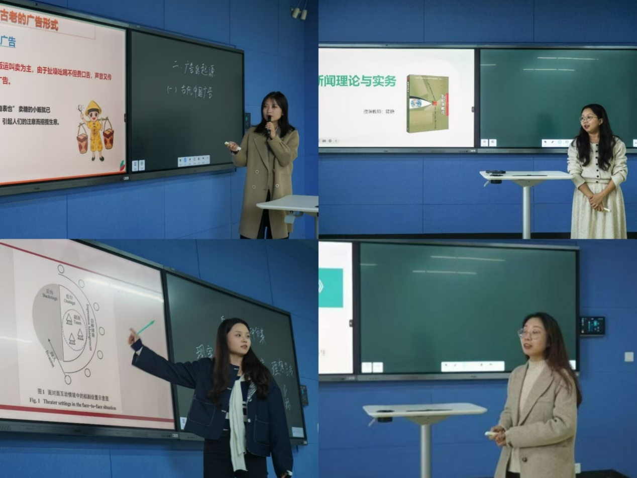 接着,四位老师开始按照顺序进行展示。第一位磨课老师武璇对《广告学概论》这门课程进行了简单介绍,讲述了这门课程的概念和相关定义。利用案例引入教学的方式强调了广告形式的多样性和丰富性。第二位磨课老师隆艳对《新闻学概论》的教学流程进行了简单阐述。指出了虚假新闻对于自身,社会和国家的恶劣影响。第三位磨课老师董雅茜对《网络心理学》这门课程进行了简单讲解。她举出了自我的三种分类:现实自我,规范自我和理想自我,探讨了其背后的受众心理以及行为特征。第四位磨课老师卫姚伊选择了新闻传媒写作讲述了作为记者的三个核心:政治素养,知识储备和心理素质。