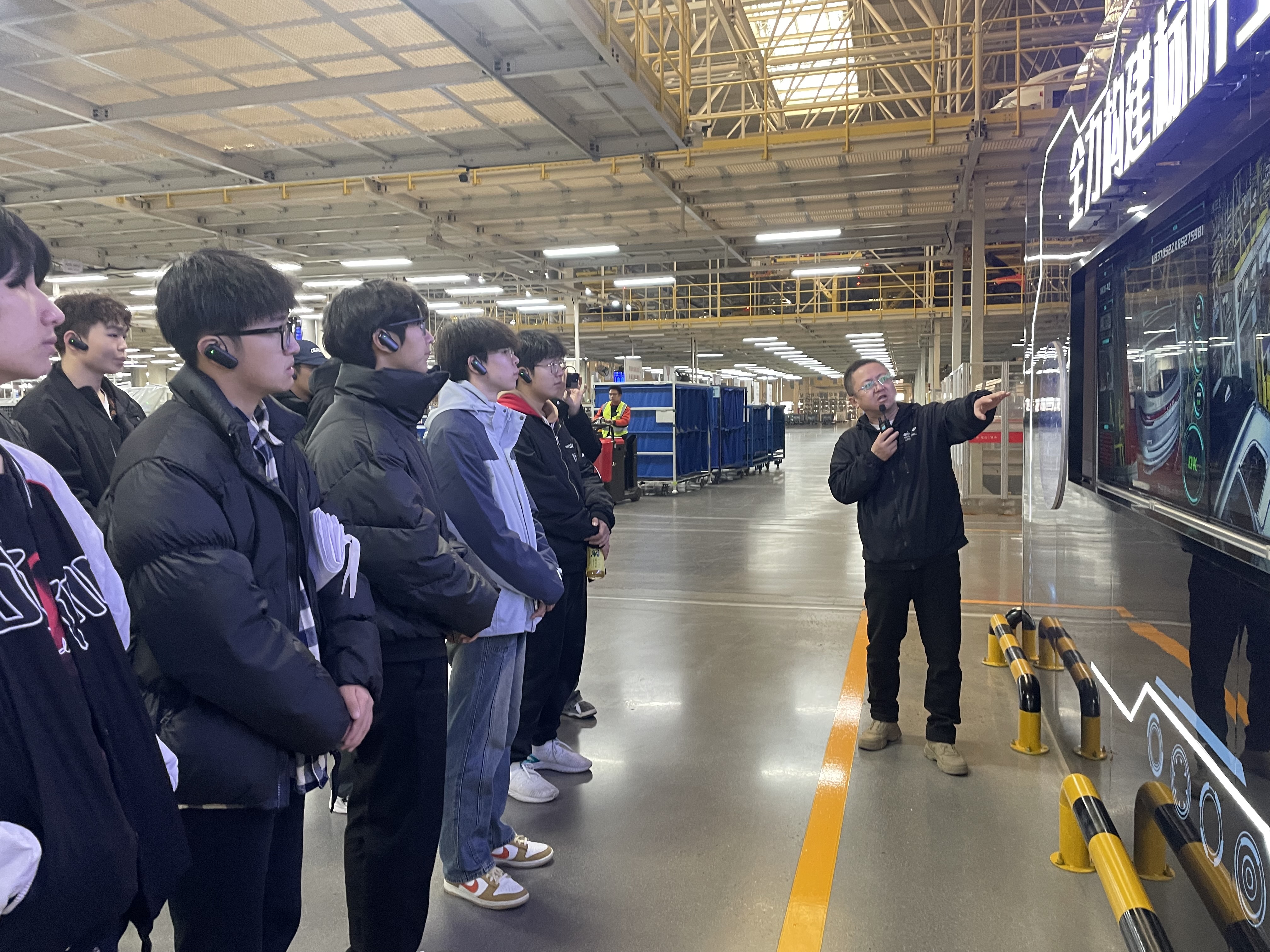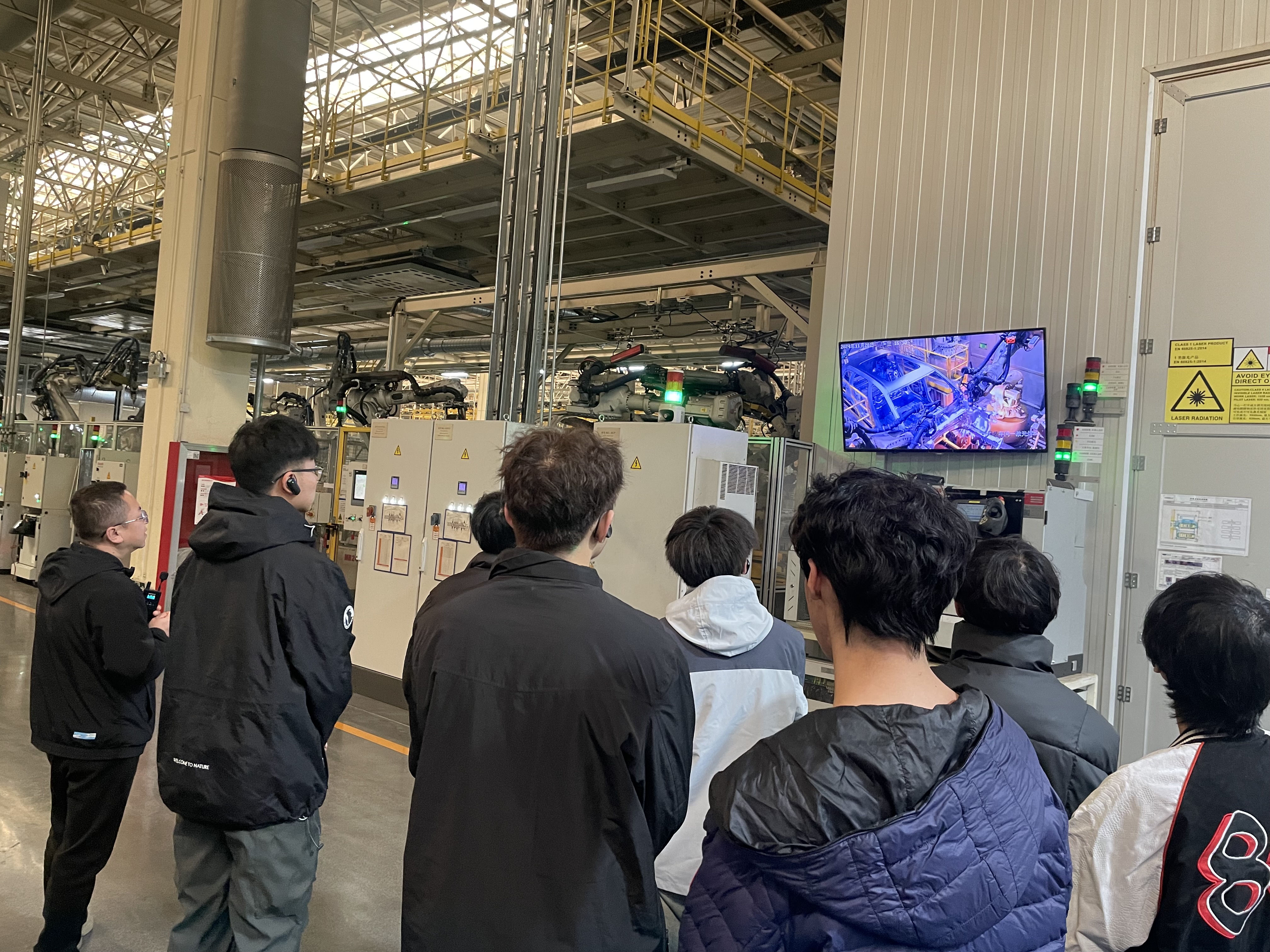 在吉利汽车西安制造基地人力资源部及生产线相关负责人的带领下,机电工程学院昕睿班师生走进厂区体验现代化汽车生产线的全流程。学生们一进入采用先进技术的冲压车间,映入眼帘的是智能机器人、全时实时监控、“运输连廊”等智能化生产设备,同学们无不为之感到震撼。来到全自动化操作的焊装车间,一排排工业机器人正进行着精准焊接,火花四溅,工业之美展现的淋漓尽致,进入到全面实现无人喷涂的涂装车间,现代工艺的精妙绝伦令人折服,在集数字化、自动化、智能化、柔性化为一体的总装车间,同学们切身感受了整车下线的壮观场面。
