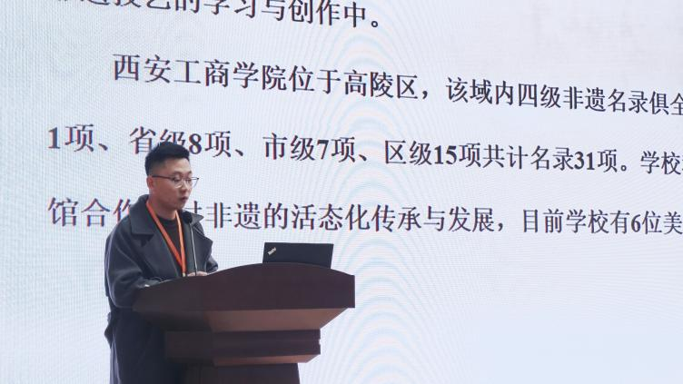 我校美育教研室主任赵明煜作了题为《地方特色美育课程开发与教学实践研究——以高陵扎花融入大学美育课程为例》的报告