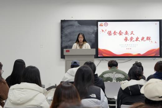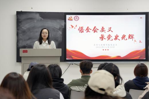 最后,艺术与传媒学院党总支组织委员孙诗睿同志作总结发言,激昂号召全体学生党员、发展对象及入党积极分子,要以史为师、传承红色基因,当好党的故事“讲述者”、声音“传播者”,立足校园、辐射社会,助力学院高质量发展,为实现中国式现代化添砖加瓦。