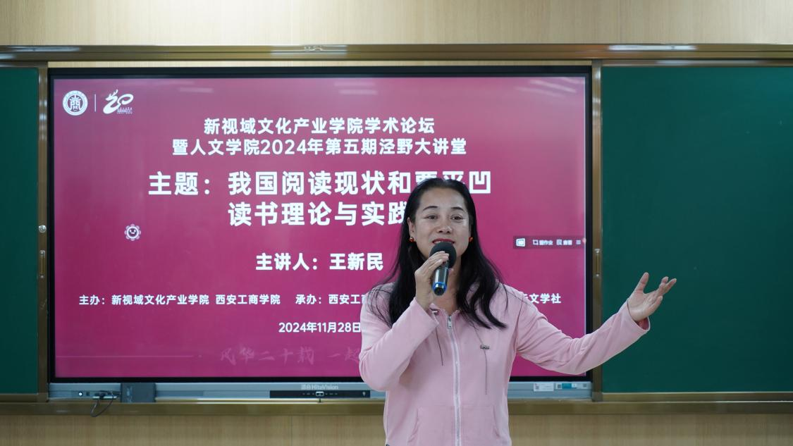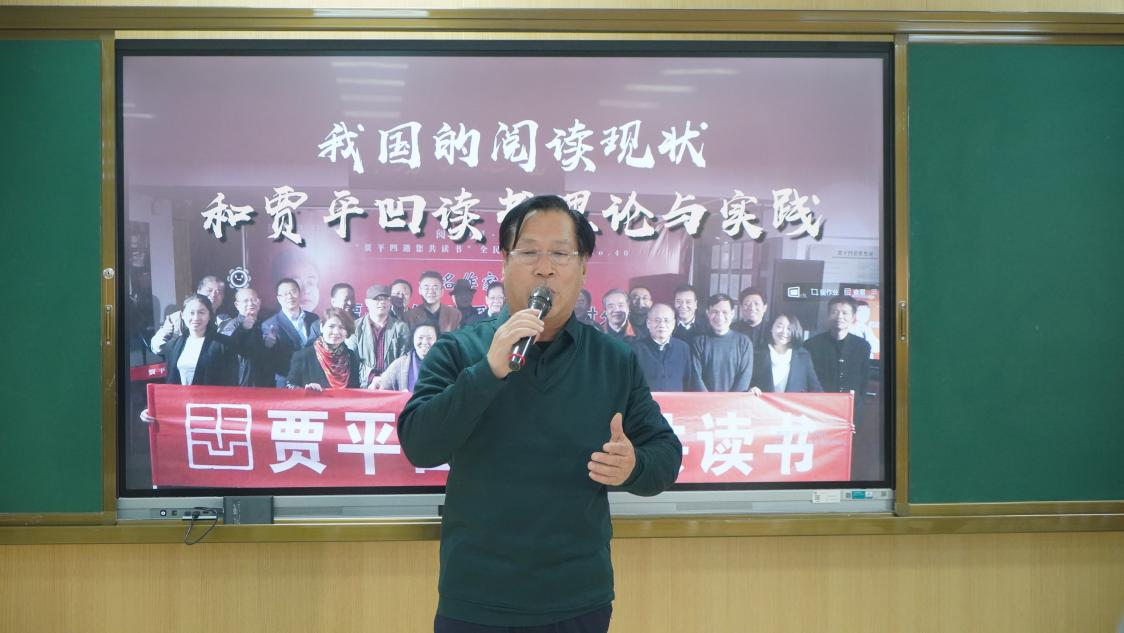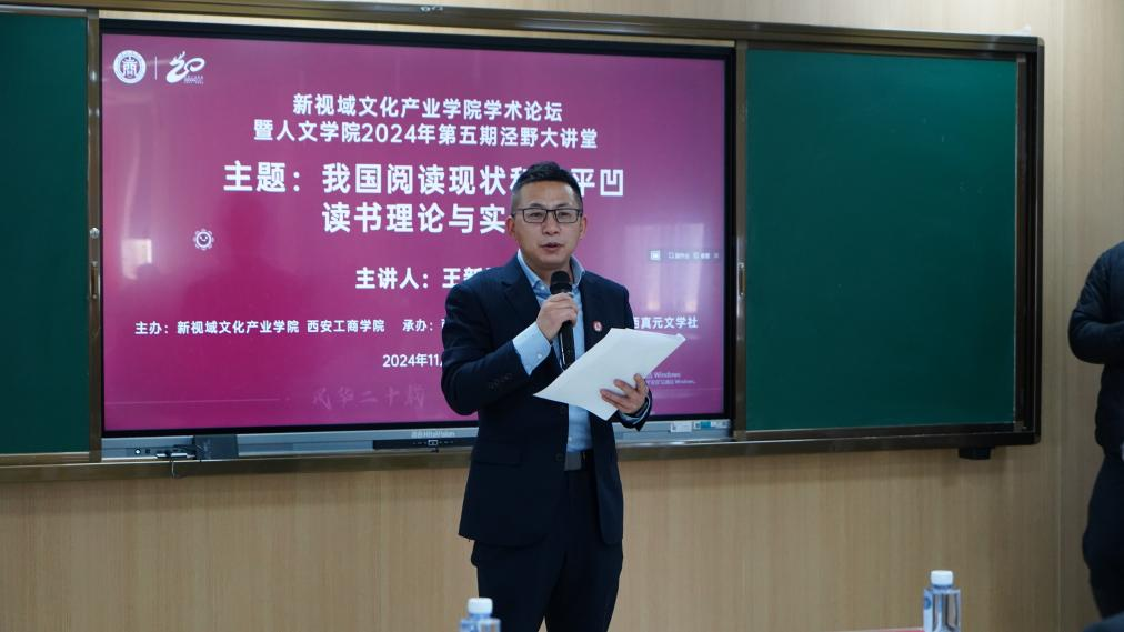 11月28日下午,新视域文化产业学院学术论坛暨人文学院第五期泾野大讲堂——“我国的阅读现状和贾平凹读书理论与实践”论坛在西安工商学院图书馆圆满举办,此次论坛主办单位为新视域文化产业学院、西安工商学院,承办单位为西安工商学院人文学院,协办单位为陕西真元文学社。论坛由人文学院党总支副书记、副院长原朝阳和西安市作协会员、真元文学社常务社长常亮共同担任主持。
