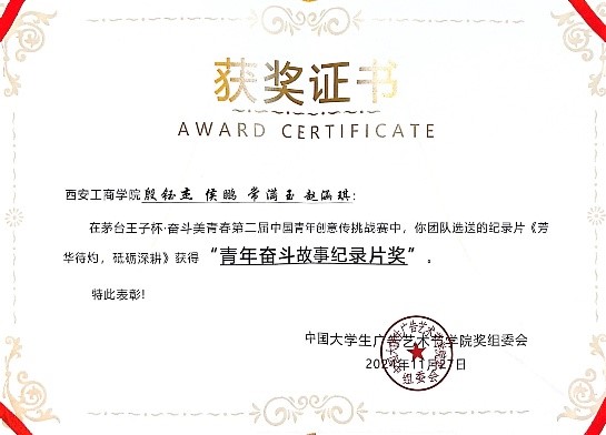 本次大赛妙品纷呈,别出心裁,在此次评选中,我校选送的纪录片作品《芳华待灼,砥砺深耕》备受瞩目,该作品亲身采访到北疆应急救援队成员侯鹏同学,展现了青年一代勇于担当、敢于奉献的精神风貌。为此,茅台王子酒特设茅台王子杯成果发布环节,授予证书及奖金鼓励。这一荣誉见证了师生们的创意与努力,又再一次证明了茅台王子酒品牌坚持创新、鼓励实践的坚定信念。在典礼现场,各行各业的业界大咖惊喜现身,共聚一堂,一同见证此次青春盛典。